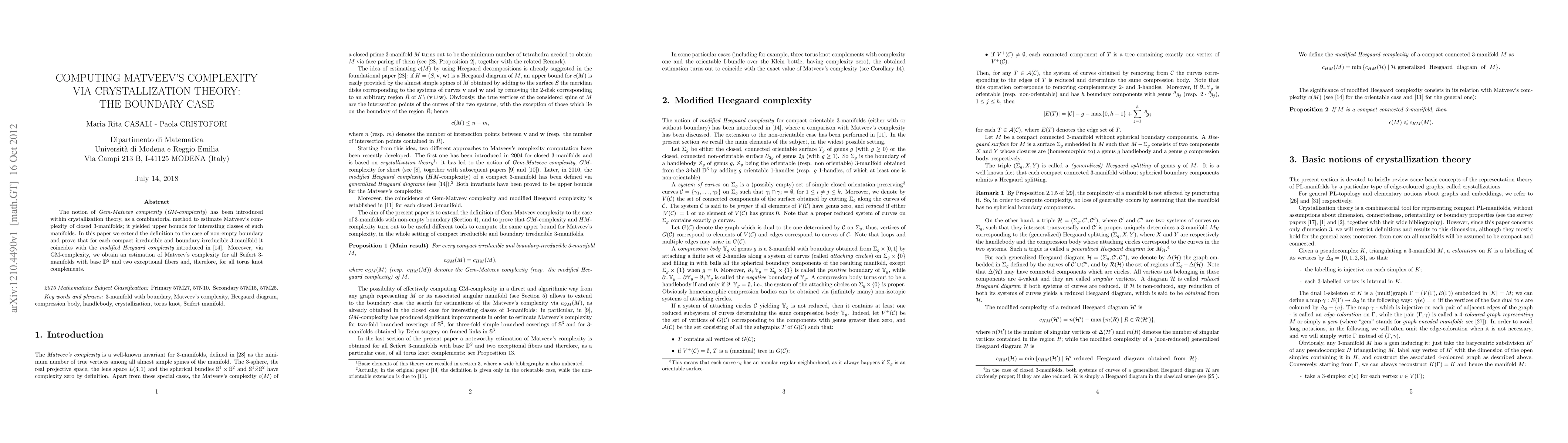The notion of Gem-Matveev complexity has been introduced within crystallization theory, as a combinatorial method to estimate Matveev's complexity of closed 3-manifolds; it yielded upper bounds for interesting classes of such manifolds. In this paper we extend the definition to the case of non-empty boundary and prove that for each compact irreducible and boundary-irreducible 3-manifold it coincides with the modified Heegaard complexity introduced by Cattabriga, Mulazzani and Vesnin. Moreover, via Gem-Matveev complexity, we obtain an estimation of Matveev's complexity for all Seifert 3-manifolds with base $\mathbb D^2$ and two exceptional fibers and, therefore, for all torus knot complements.