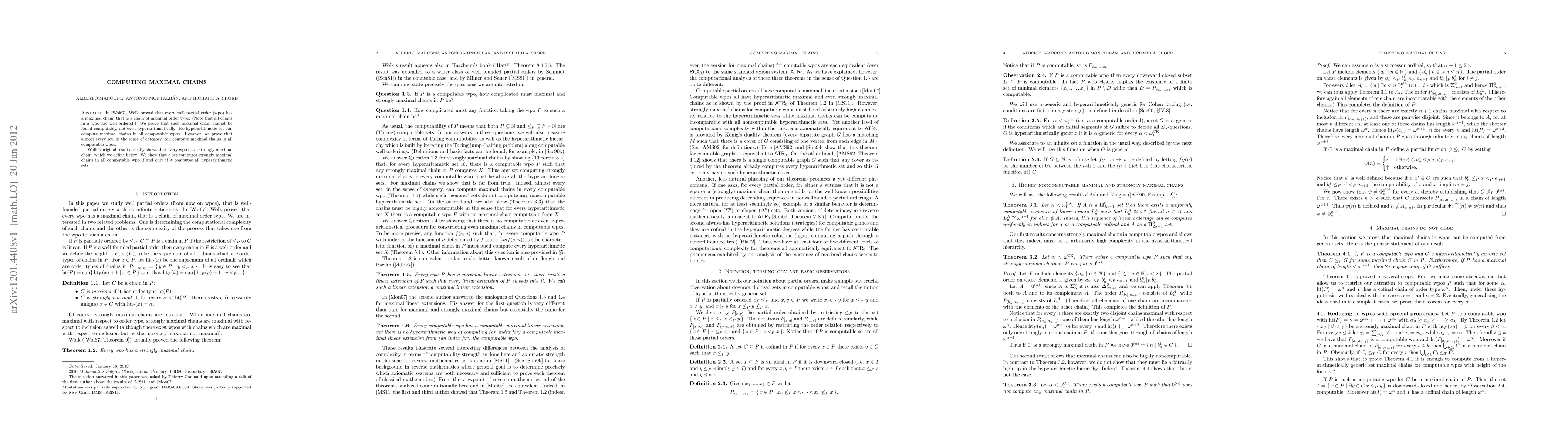 This paper proves that maximal chains in well partial orders cannot be found computably or even hyperarithmetically. It also demonstrates that almost every set can compute maximal chains in all computable well partial orders, while strongly maximal chains can only be computed by sets that compute all hyperarithmetic sets.