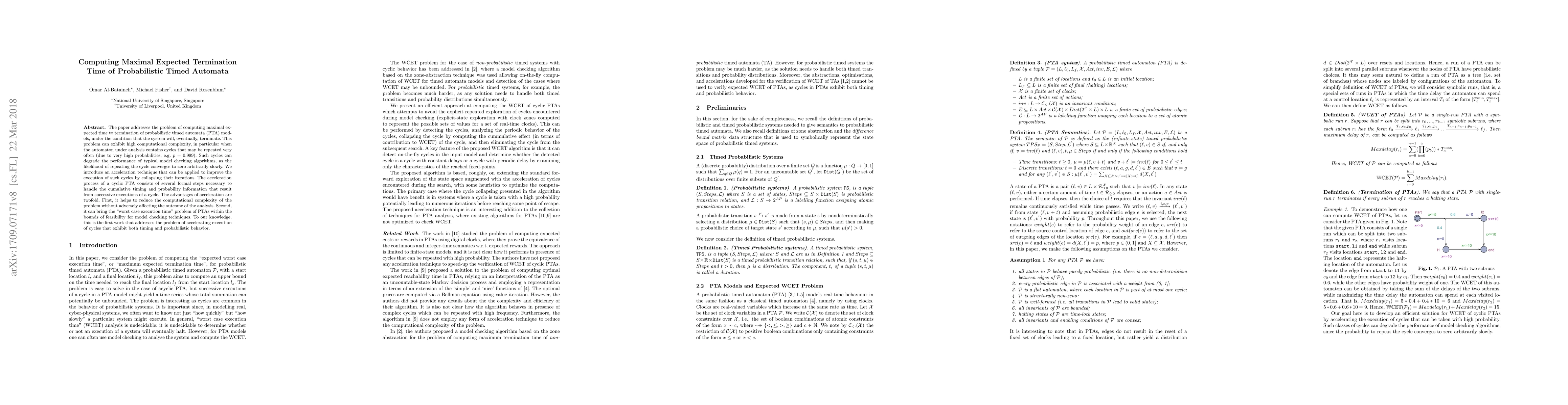 The paper presents an acceleration technique for computing maximal expected termination time of PTAs, which collapses iterations of cycles using formal steps to handle cumulative timing and probability information.