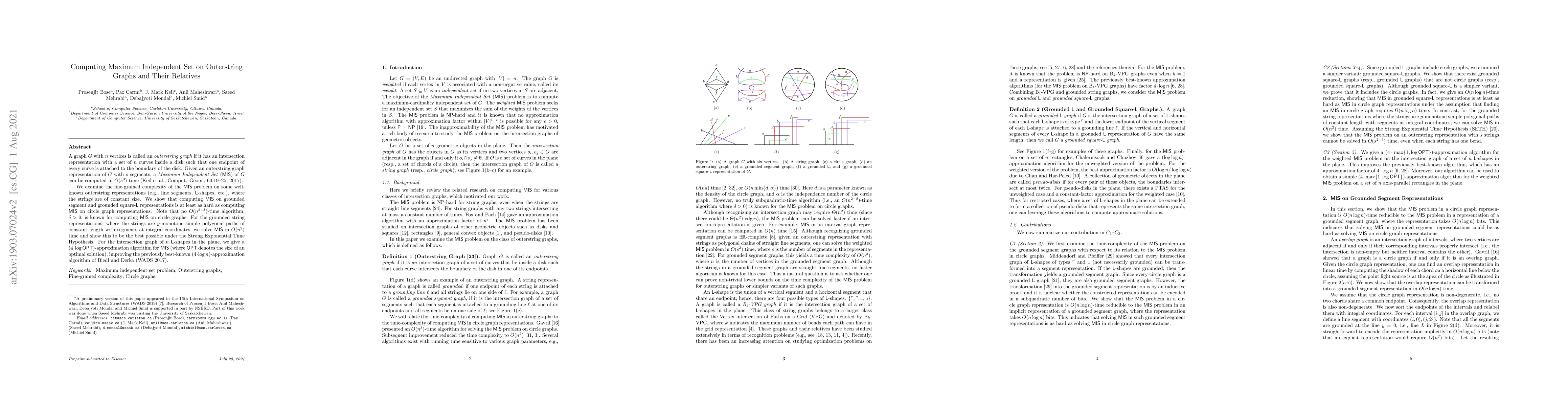 The paper explores the complexity of finding the maximum independent set in various outerstring graph representations, showing that some can be solved more efficiently than others, with applications to solving circle graphs and approximating solutions for L-shape intersection graphs.