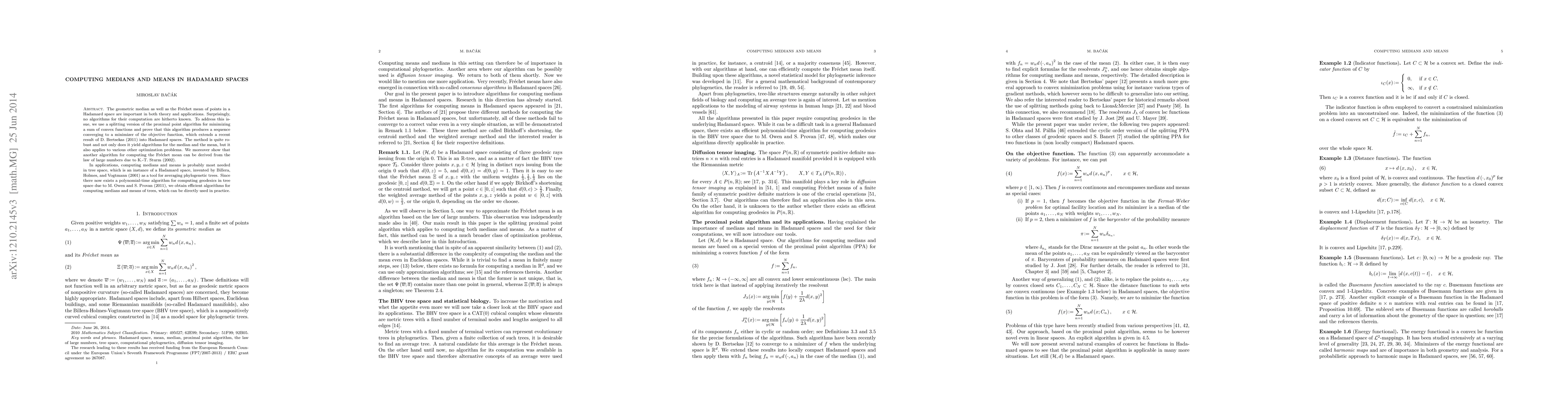 The geometric median as well as the Frechet mean of points in an Hadamard space are important in both theory and applications. Surprisingly, no algorithms for their computation are hitherto known. To address this issue, we use a split version of the proximal point algorithm for minimizing a sum of convex functions and prove that this algorithm produces a sequence converging to a minimizer of the objective function, which extends a recent result of D. Bertsekas (2001) into Hadamard spaces. The method is quite robust and not only does it yield algorithms for the median and the mean, but it also applies to various other optimization problems. We moreover show that another algorithm for computing the Frechet mean can be derived from the law of large numbers due to K.-T. Sturm (2002). In applications, computing medians and means is probably most needed in tree space, which is an instance of an Hadamard space, invented by Billera, Holmes, and Vogtmann (2001) as a tool for averaging phylogenetic trees. It turns out, however, that it can be also used to model numerous other tree-like structures. Since there now exists a polynomial-time algorithm for computing geodesics in tree space due to M. Owen and S. Provan (2011), we obtain efficient algorithms for computing medians and means, which can be directly used in practice.
