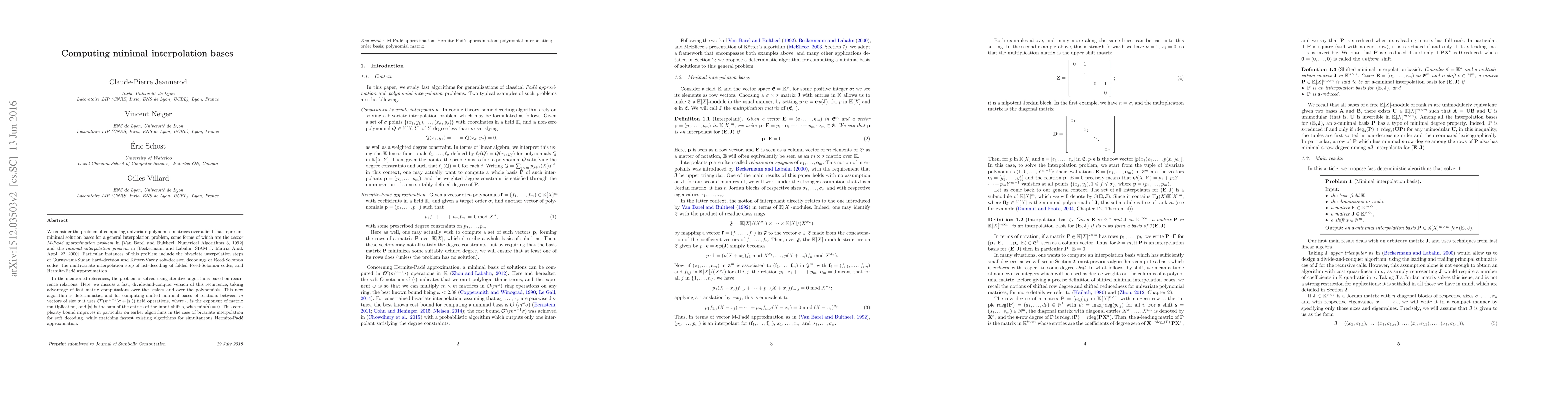 This paper presents a new fast, divide-and-conquer algorithm for computing minimal interpolation bases for univariate polynomial matrices, improving upon previous iterative methods. The proposed algorithm achieves a complexity of $O~( m^{\omega-1} (\sigma + |s|) )$ field operations, outperforming earlier algorithms for specific interpolation problems like bivariate interpolation for soft decoding.