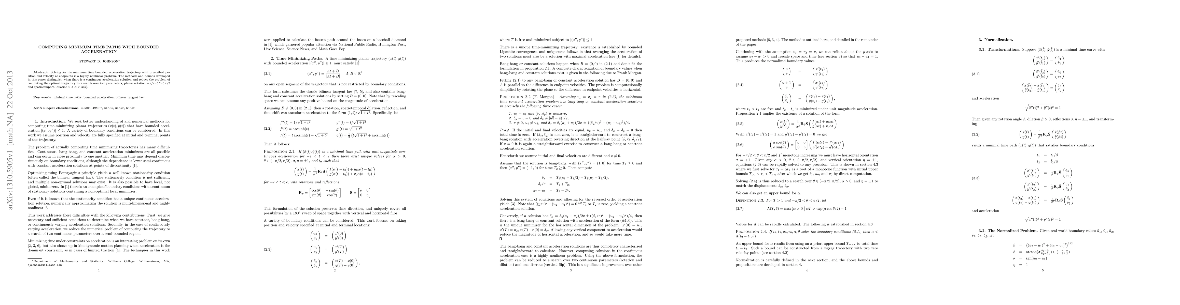 This paper develops methods to solve a nonlinear problem of finding minimum time paths with bounded acceleration, reducing it to searching over two parameters: planar rotation and spatiotemporal dilation.