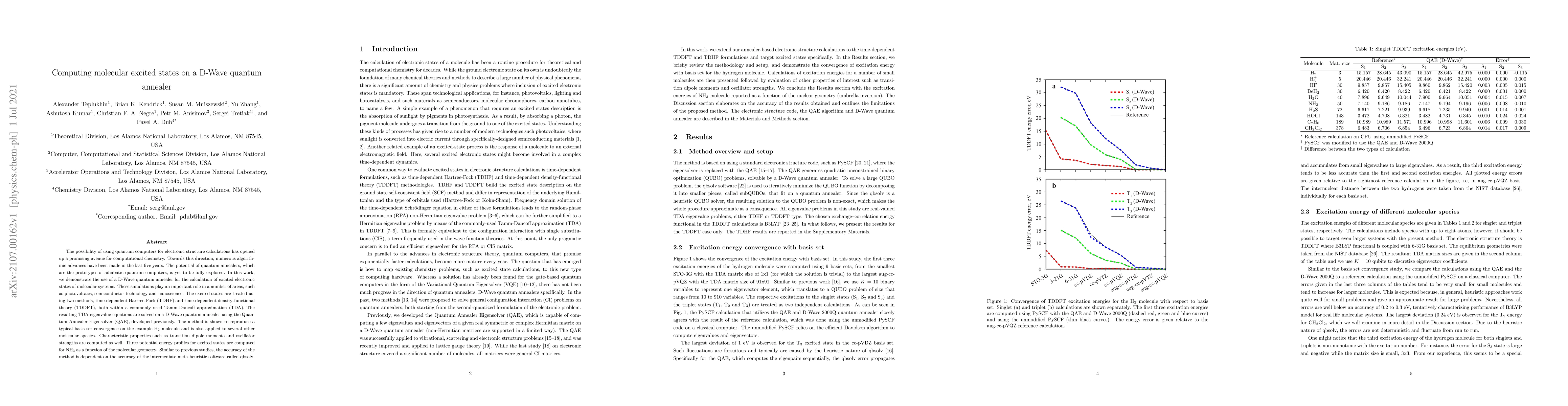 This paper explores the application of a D-Wave quantum annealer for calculating excited electronic states using TDHF and TDDFT methods, demonstrating its potential in computational chemistry for areas like photovoltaics and nanoscience. The method shows basis set convergence and computes properties such as transition dipole moments, with accuracy dependent on the qbsolv software.