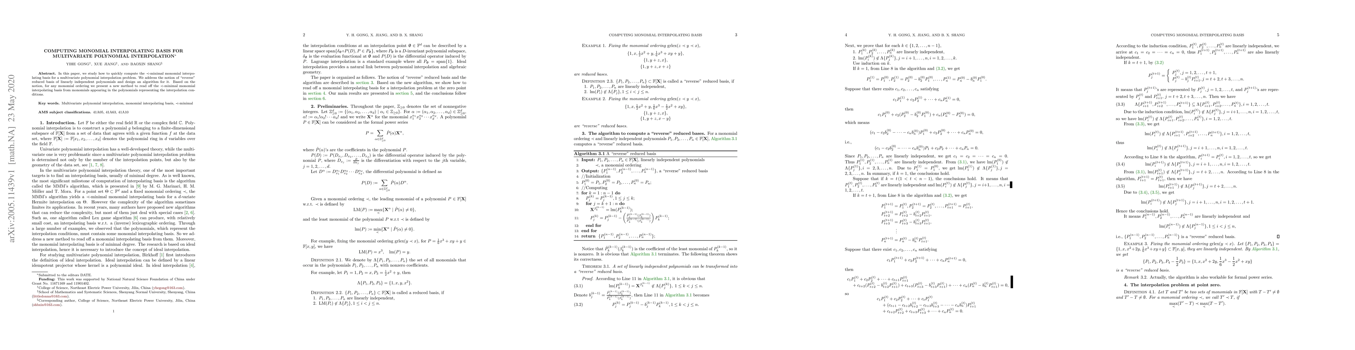 The paper presents an algorithm to compute the <-minimal monomial interpolating basis for multivariate polynomial interpolation, using the concept of a 'reverse' reduced basis for any given monomial ordering.