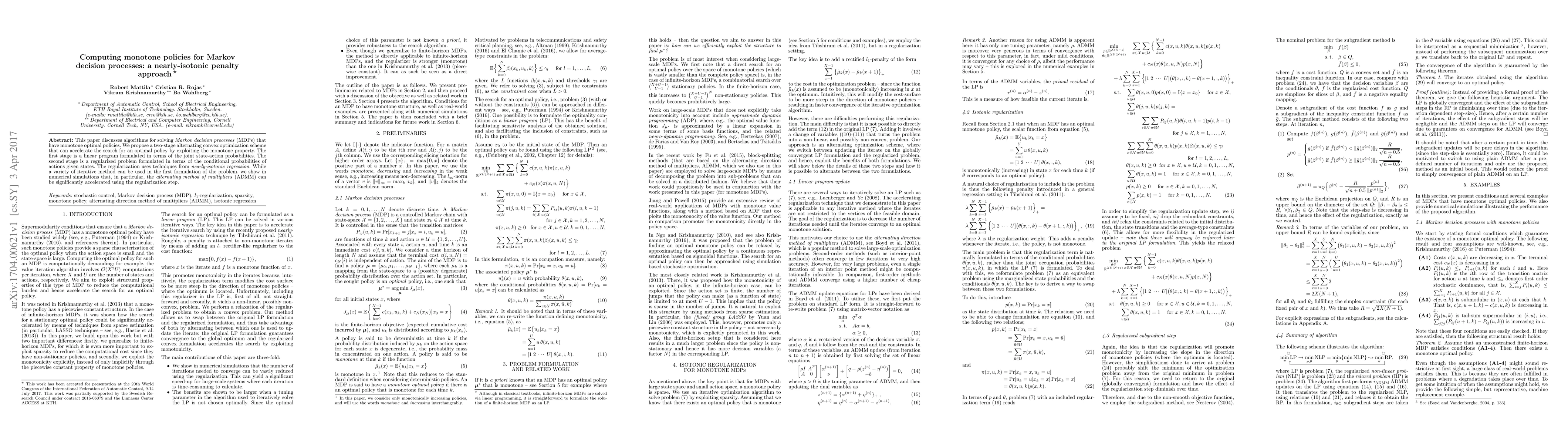This paper proposes a two-stage alternating convex optimization scheme to solve Markov decision processes with monotone optimal policies, accelerating the search using regularization techniques from nearly-isotonic regression.