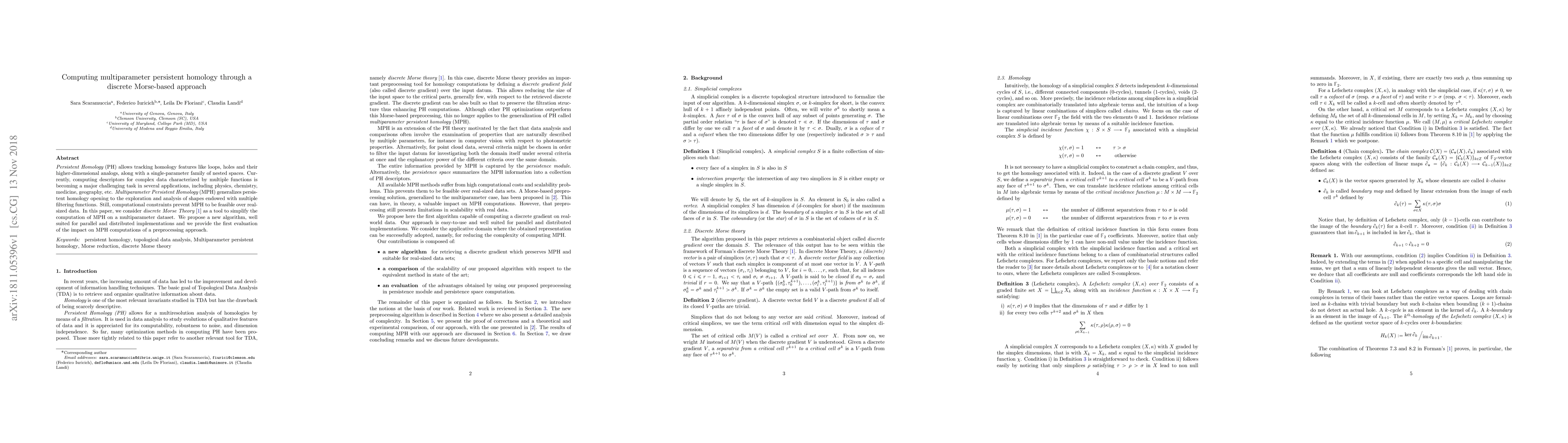 This paper proposes a new algorithm leveraging discrete Morse Theory to simplify the computation of Multiparameter Persistent Homology (MPH) on complex datasets with multiple filtering functions, addressing computational constraints for applications in physics, chemistry, and more. The approach is designed for parallel and distributed implementations, and it evaluates the impact of preprocessing on MPH computations.