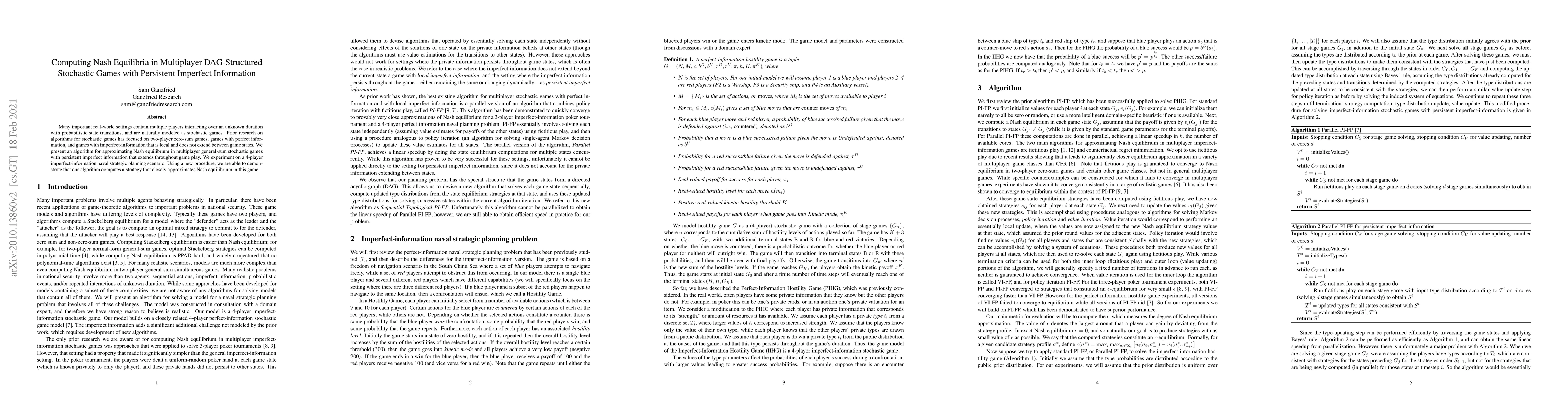 This paper proposes an algorithm to approximate Nash equilibrium in multiplayer stochastic games with persistent imperfect information, extending beyond previous models. The algorithm is tested in a 4-player naval strategic planning scenario, demonstrating its effectiveness in achieving a near-equilibrium strategy.