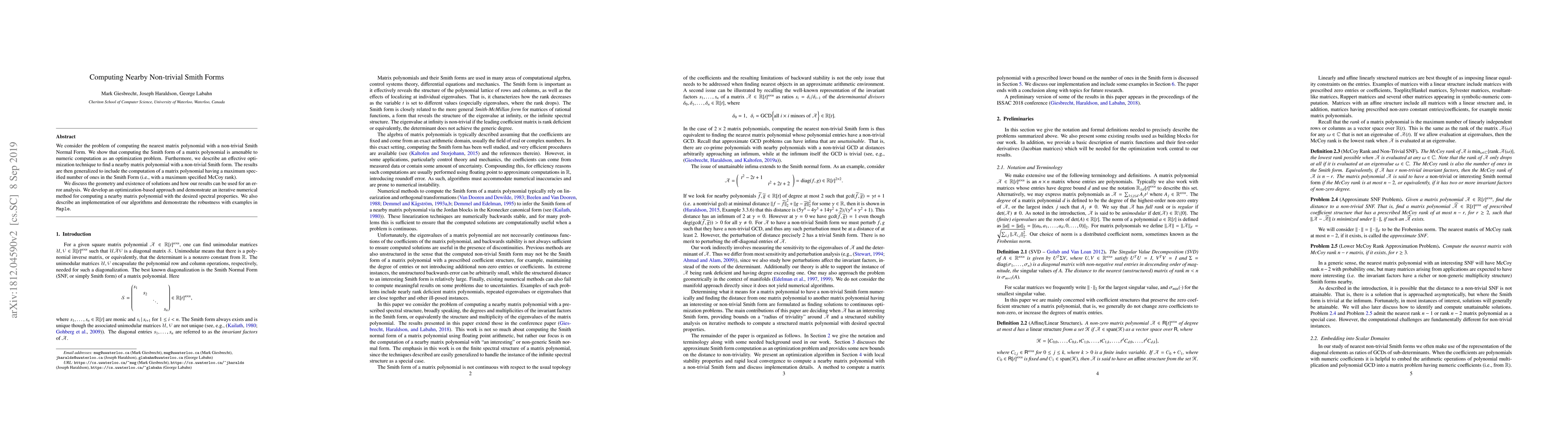We consider the problem of computing the nearest matrix polynomial with a non-trivial Smith Normal Form. We show that computing the Smith form of a matrix polynomial is amenable to numeric computation as an optimization problem. Furthermore, we describe an effective optimization technique to find a nearby matrix polynomial with a non-trivial Smith form. The results are then generalized to include the computation of a matrix polynomial having a maximum specified number of ones in the Smith Form (i.e., with a maximum specified McCoy rank). We discuss the geometry and existence of solutions and how our results can be used for an error analysis. We develop an optimization-based approach and demonstrate an iterative numerical method for computing a nearby matrix polynomial with the desired spectral properties. We also describe an implementation of our algorithms and demonstrate the robustness with examples in Maple.