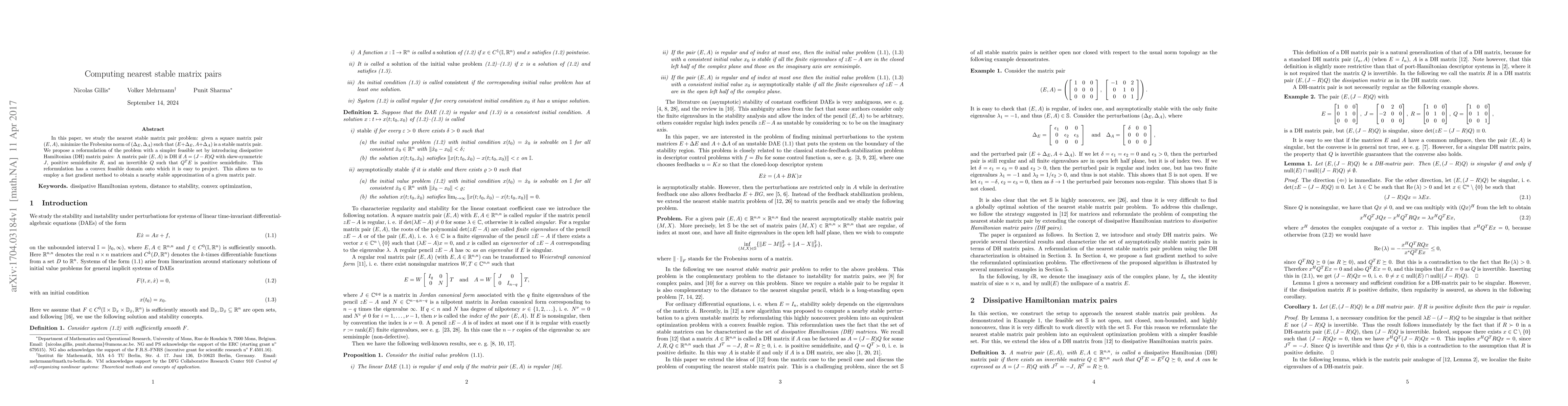 In this paper, we study the nearest stable matrix pair problem: given a square matrix pair $(E,A)$, minimize the Frobenius norm of $(\Delta_E,\Delta_A)$ such that $(E+\Delta_E,A+\Delta_A)$ is a stable matrix pair. We propose a reformulation of the problem with a simpler feasible set by introducing dissipative Hamiltonian (DH) matrix pairs: A matrix pair $(E,A)$ is DH if $A=(J-R)Q$ with skew-symmetric $J$, positive semidefinite $R$, and an invertible $Q$ such that $Q^TE$ is positive semidefinite. This reformulation has a convex feasible domain onto which it is easy to project. This allows us to employ a fast gradient method to obtain a nearby stable approximation of a given matrix pair.