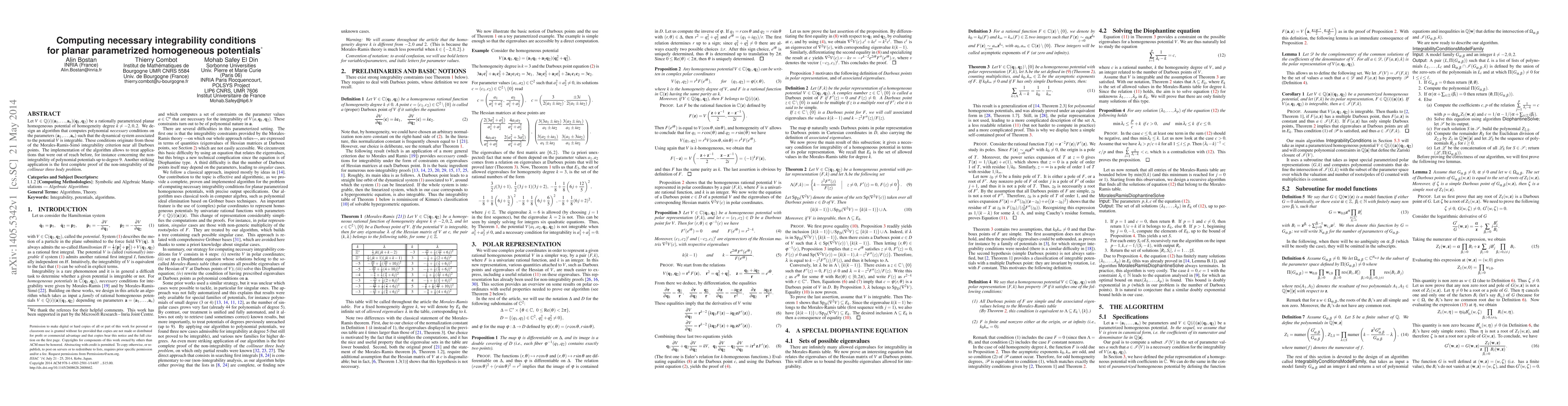 This paper presents an algorithm to compute necessary conditions for the integrability of planar parametrized homogeneous potentials, based on the Morales-Ramis-Simó criterion. It successfully applies this method to prove the non-integrability of polynomial potentials up to degree 9 and provides the first complete proof of the non-integrability of the collinear three body problem.