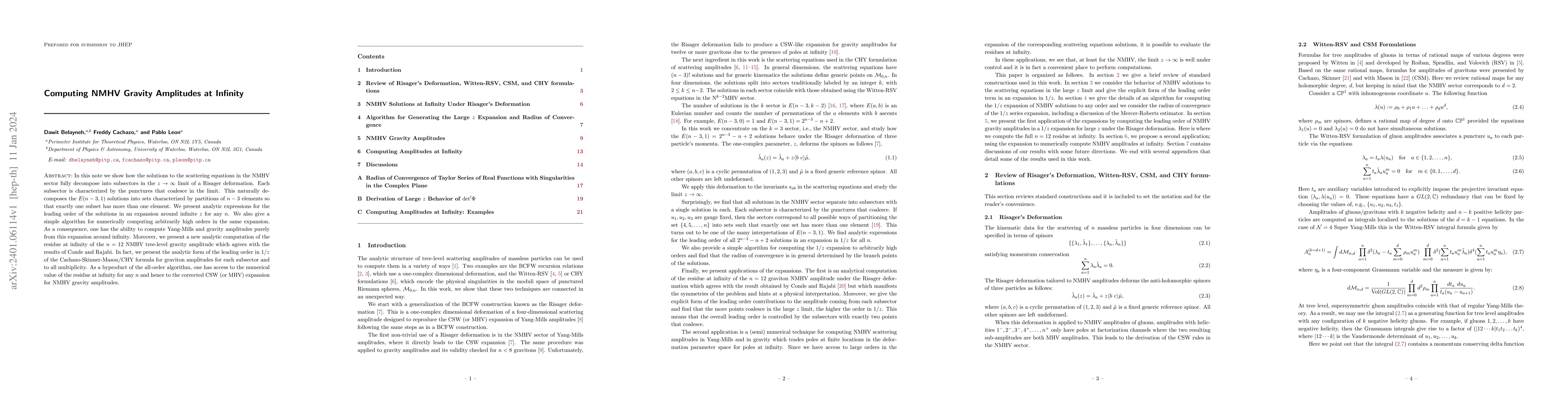 In this note we show how the solutions to the scattering equations in the NMHV sector fully decompose into subsectors in the $z\to \infty$ limit of a Risager deformation. Each subsector is characterized by the punctures that coalesce in the limit. This naturally decomposes the $E(n-3,1)$ solutions into sets characterized by partitions of $n-3$ elements so that exactly one subset has more than one element. We present analytic expressions for the leading order of the solutions in an expansion around infinite $z$ for any $n$. We also give a simple algorithm for numerically computing arbitrarily high orders in the same expansion. As a consequence, one has the ability to compute Yang-Mills and gravity amplitudes purely from this expansion around infinity. Moreover, we present a new analytic computation of the residue at infinity of the $n=12$ NMHV tree-level gravity amplitude which agrees with the results of Conde and Rajabi. In fact, we present the analytic form of the leading order in $1/z$ of the Cachazo-Skinner-Mason/CHY formula for graviton amplitudes for each subsector and to all multiplicity. As a byproduct of the all-order algorithm, one has access to the numerical value of the residue at infinity for any $n$ and hence to the corrected CSW (or MHV) expansion for NMHV gravity amplitudes.