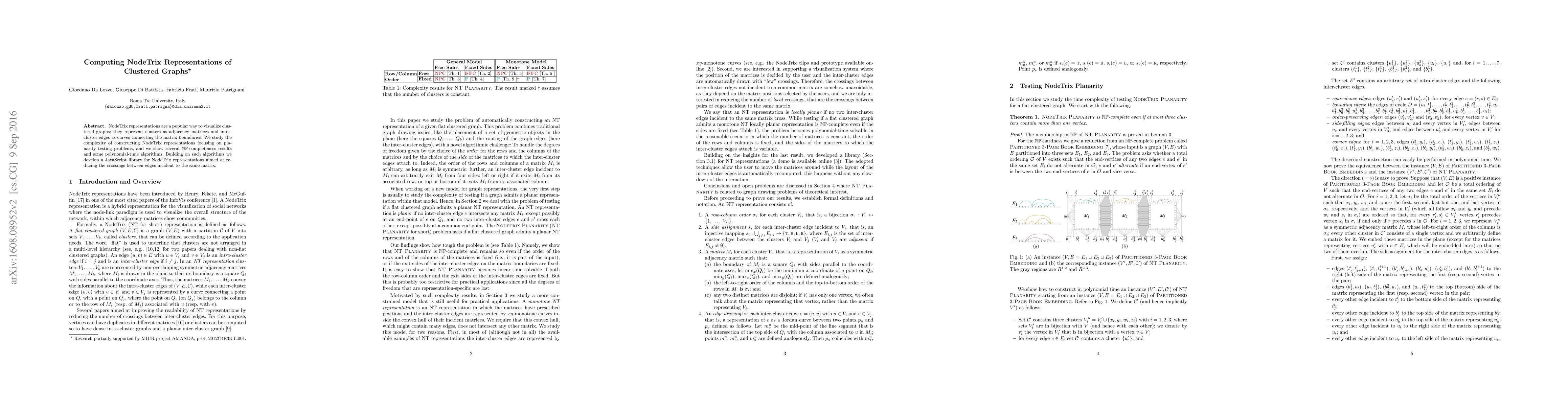 This paper explores the complexity of constructing NodeTrix representations for clustered graphs, proving several NP-completeness results and developing polynomial-time algorithms for planarity testing. It also introduces a JavaScript library to minimize edge crossings in these representations.