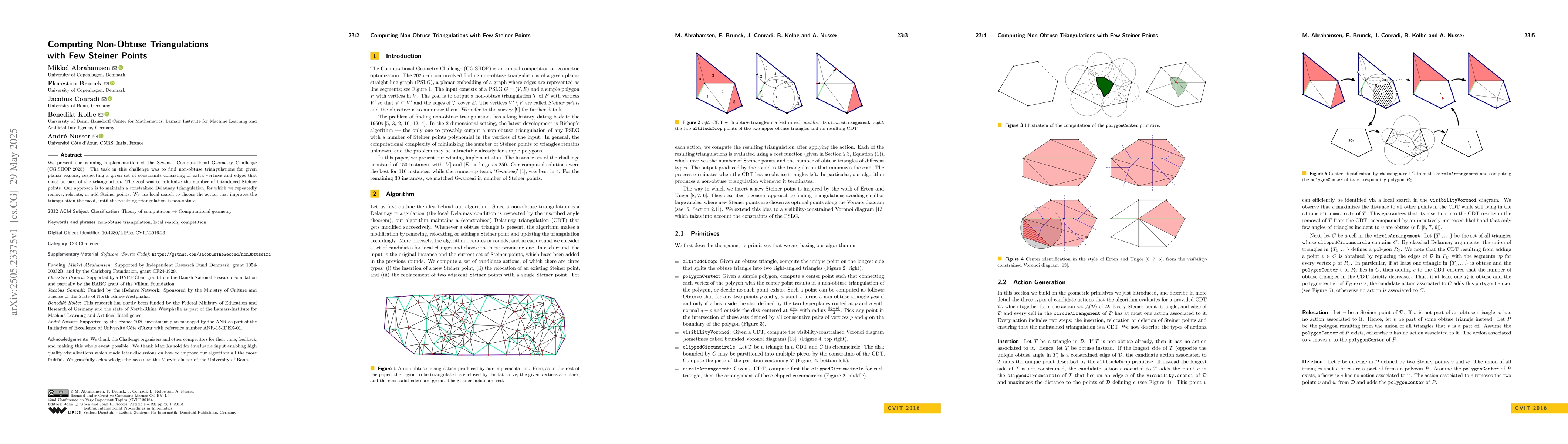 The paper presents an algorithm for constructing non-obtuse triangulations with few Steiner points using constrained Delaunay triangulations and local search optimizations.