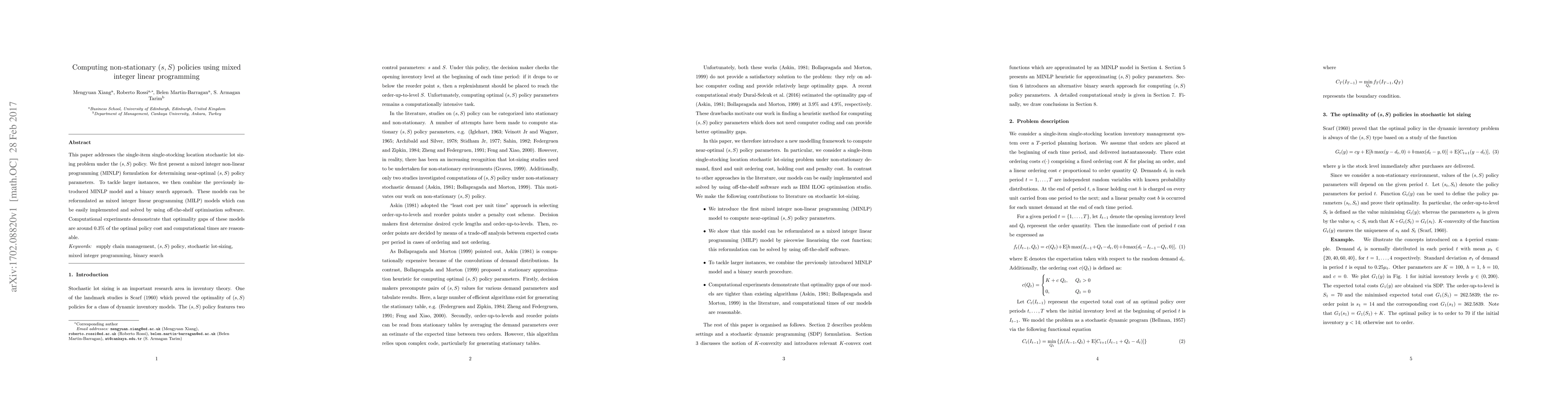 This paper addresses the single-item single-stocking location stochastic lot sizing problem under the $(s, S) $ policy. We first present a mixed integer non-linear programming (MINLP) formulation for determining near-optimal $(s, S)$ policy parameters. To tackle larger instances, we then combine the previously introduced MINLP model and a binary search approach. These models can be reformulated as mixed integer linear programming (MILP) models which can be easily implemented and solved by using off-the-shelf optimisation software. Computational experiments demonstrate that optimality gaps of these models are around $0.3\%$ of the optimal policy cost and computational times are reasonable.