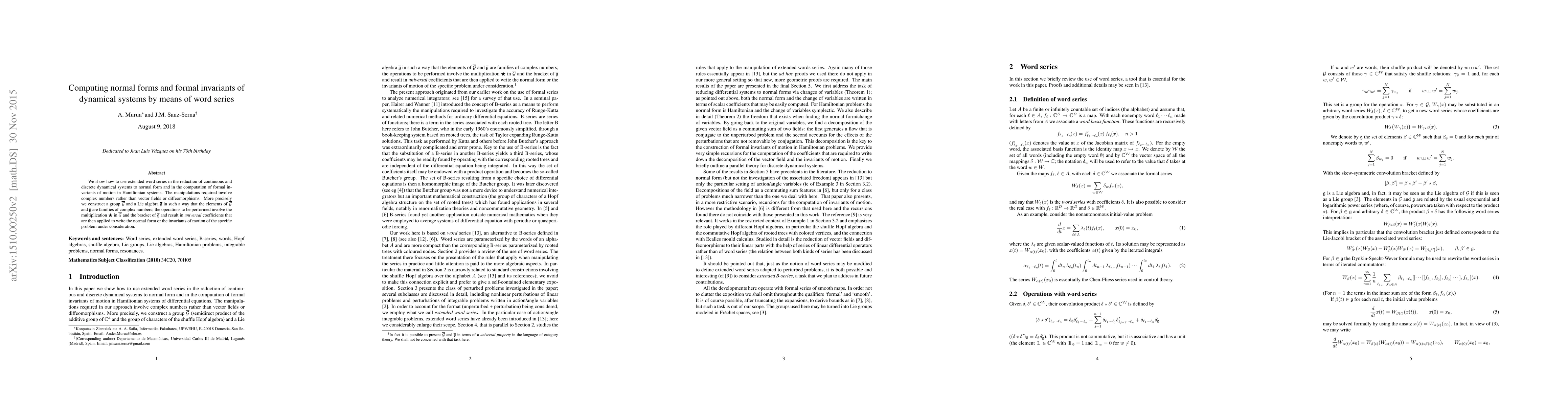 We show how to use extended word series in the reduction of continuous and discrete dynamical systems to normal form and in the computation of formal invariants of motion in Hamiltonian systems. The manipulations required involve complex numbers rather than vector fields or diffeomorphisms. More precisely we construct a group G and a Lie algebra g in such a way that the elements of G and g are families of complex numbers; the operations to be performed involve the multiplication F in G and the bracket of g and result in universal coefficients that are then applied to write the normal form or the invariants of motion of the specific problem under consideration.