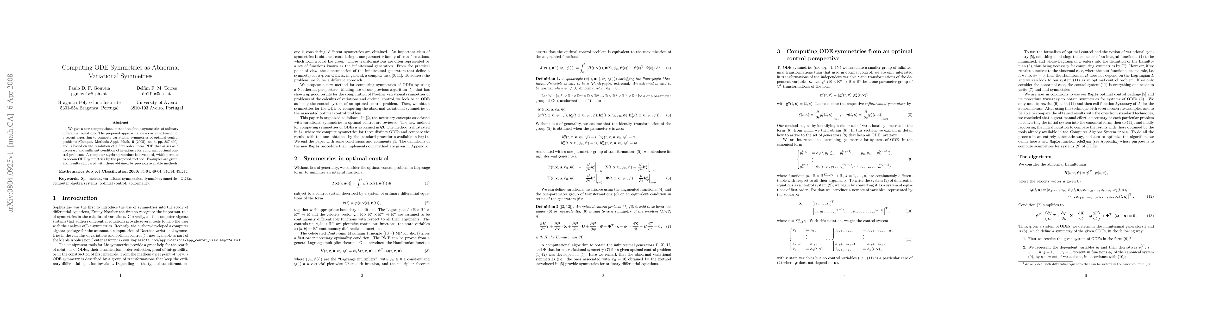 We give a new computational method to obtain symmetries of ordinary differential equations. The proposed approach appears as an extension of a recent algorithm to compute variational symmetries of optimal control problems [Comput. Methods Appl. Math. 5 (2005), no. 4, pp. 387-409], and is based on the resolution of a first order linear PDE that arises as a necessary and sufficient condition of invariance for abnormal optimal control problems. A computer algebra procedure is developed, which permits to obtain ODE symmetries by the proposed method. Examples are given, and results compared with those obtained by previous available methods.