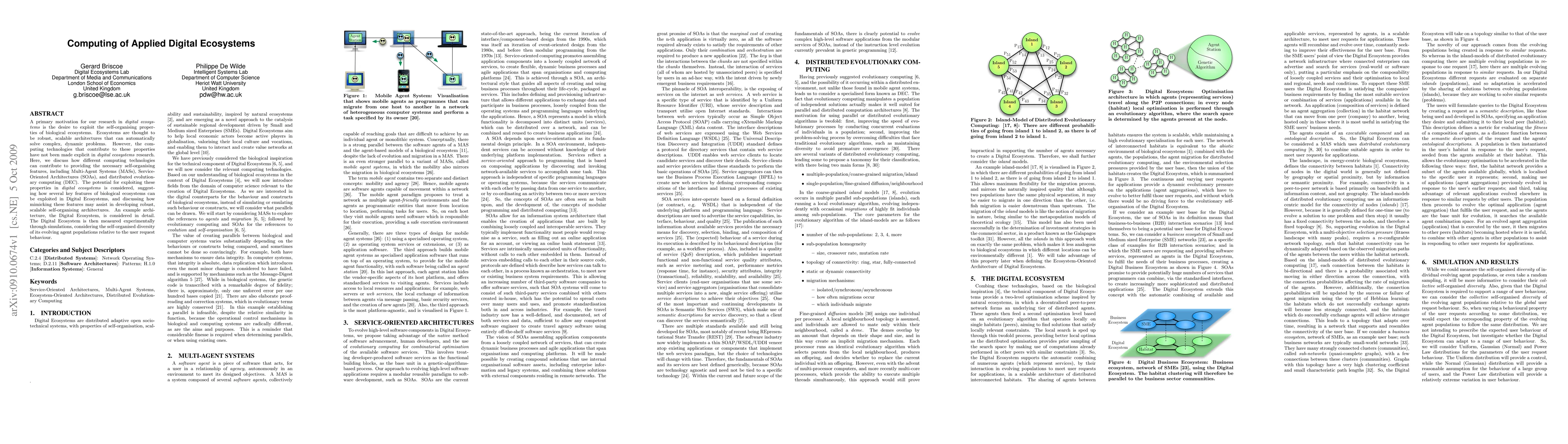 This paper explores how computing technologies like Multi-Agent Systems, Service-Oriented Architectures, and distributed evolutionary computing can enable self-organising features in digital ecosystems, mimicking the robustness and scalability of biological ecosystems. An example architecture is presented and tested experimentally to assess its self-organised diversity in response to user requests.