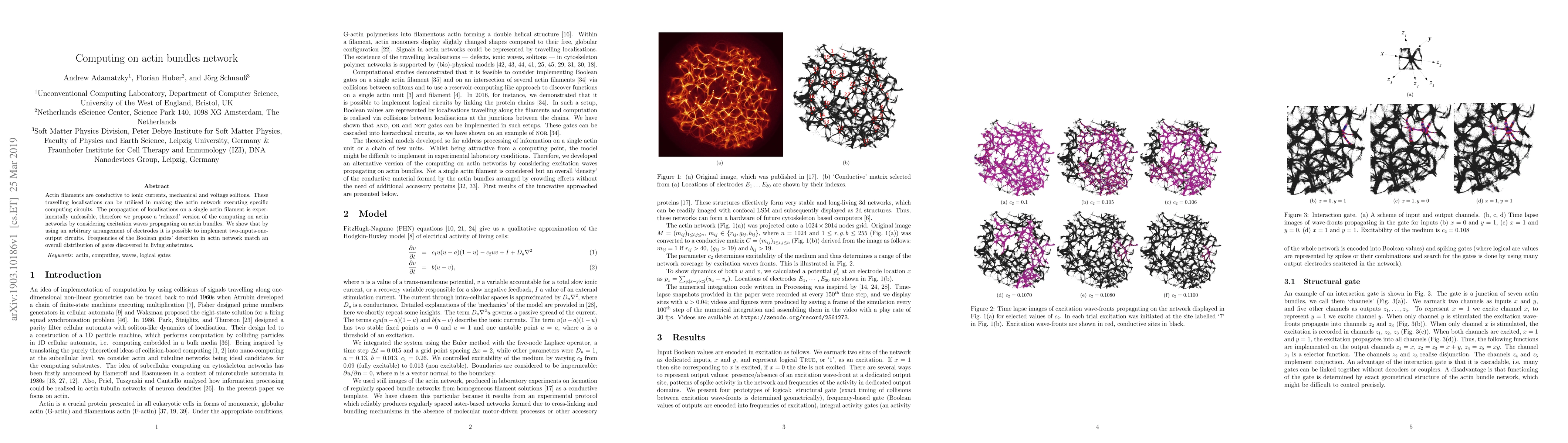 Actin filaments are conductive to ionic currents, mechanical and voltage solitons. These travelling localisations can be utilised in making the actin network executing specific computing circuits. The propagation of localisations on a single actin filament is experimentally unfeasible, therefore we propose a `relaxed' version of the computing on actin networks by considering excitation waves propagating on actin bundles. We show that by using an arbitrary arrangement of electrodes it is possible to implement two-inputs-one-output circuits. Frequencies of the Boolean gates' detection in actin network match an overall distribution of gates discovered in living substrates.