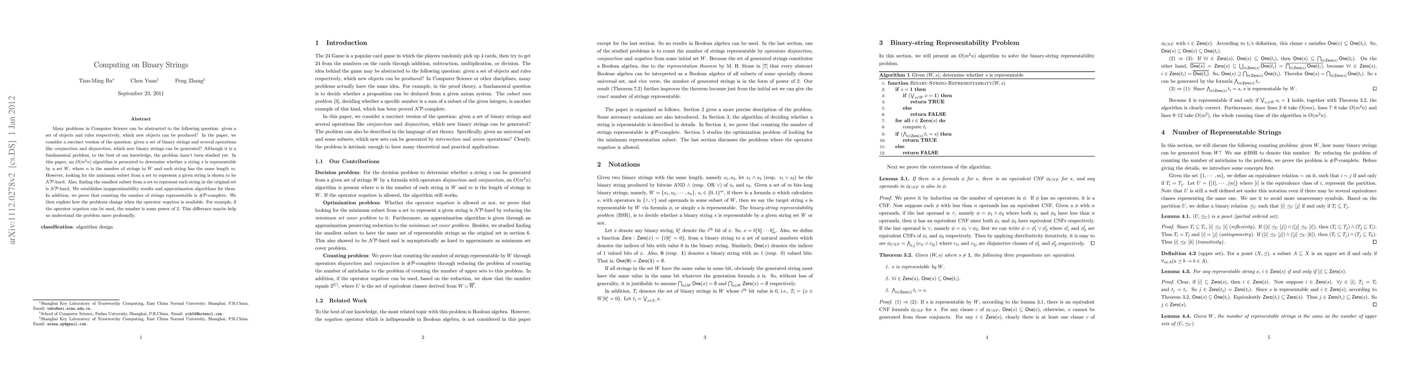 Many problems in Computer Science can be abstracted to the following question: given a set of objects and rules respectively, which new objects can be produced? In the paper, we consider a succinct version of the question: given a set of binary strings and several operations like conjunction and disjunction, which new binary strings can be generated? Although it is a fundamental problem, to the best of our knowledge, the problem hasn't been studied yet. In this paper, an O(m^2n) algorithm is presented to determine whether a string s is representable by a set W, where n is the number of strings in W and each string has the same length m. However, looking for the minimum subset from a set to represent a given string is shown to be NP-hard. Also, finding the smallest subset from a set to represent each string in the original set is NP-hard. We establishes inapproximability results and approximation algorithms for them. In addition, we prove that counting the number of strings representable is #P-complete. We then explore how the problems change when the operator negation is available. For example, if the operator negation can be used, the number is some power of 2. This difference maybe help us understand the problem more profoundly.