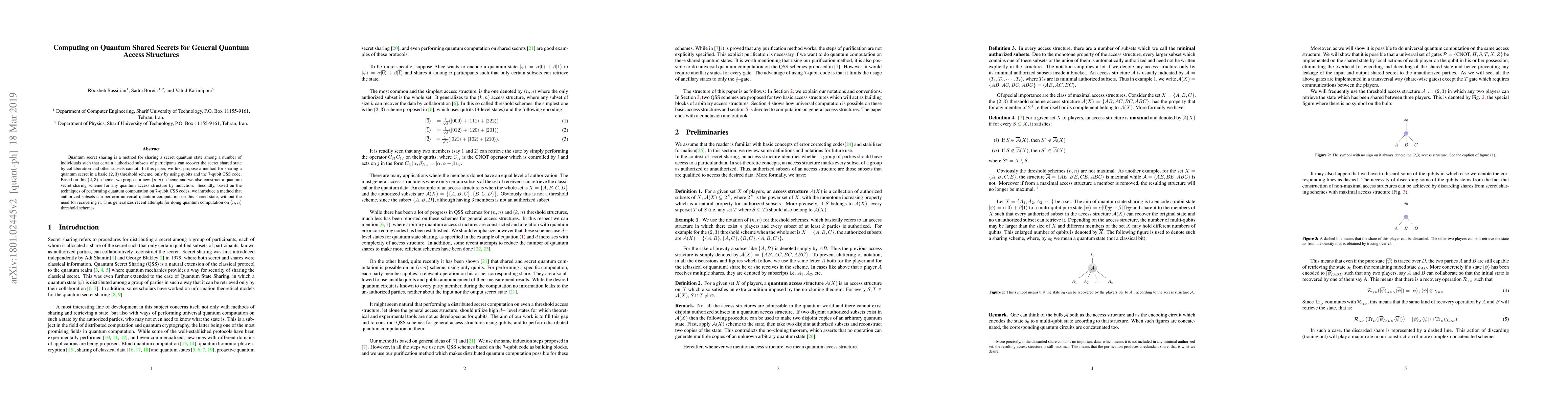 This paper proposes quantum secret sharing methods for general quantum access structures, introducing a $(2,3)$ threshold scheme using qubits and the 7-qubit CSS code, and extending it to a $(n, n)$ scheme. It also presents a method for authorized subsets to perform universal quantum computation on the shared state without recovering it.
