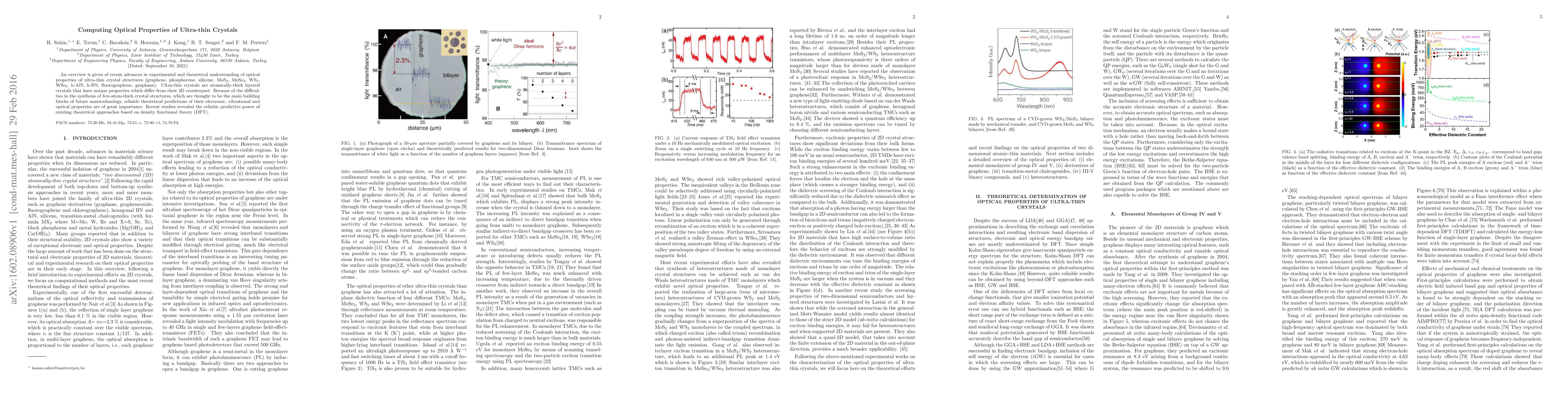 An overview is given of recent advances in experimental and theoretical understanding of optical properties of ultra-thin crystal structures (graphene, phosphorene, silicene, MoS2, MoSe2 , WS2 , WSe2 , h-AlN, h-BN, fluorographene, graphane). Ultra-thin crystals are atomically-thick layered crystals that have unique properties which differ from their 3D counterpart. Because of the difficulties in the synthesis of few-atom-thick crystal structures, which are thought to be the main building blocks of future nanotechnology, reliable theoretical predictions of their electronic, vibrational and optical properties are of great importance. Recent studies revealed the reliable predictive power of existing theoretical approaches based on density functional theory (DFT).