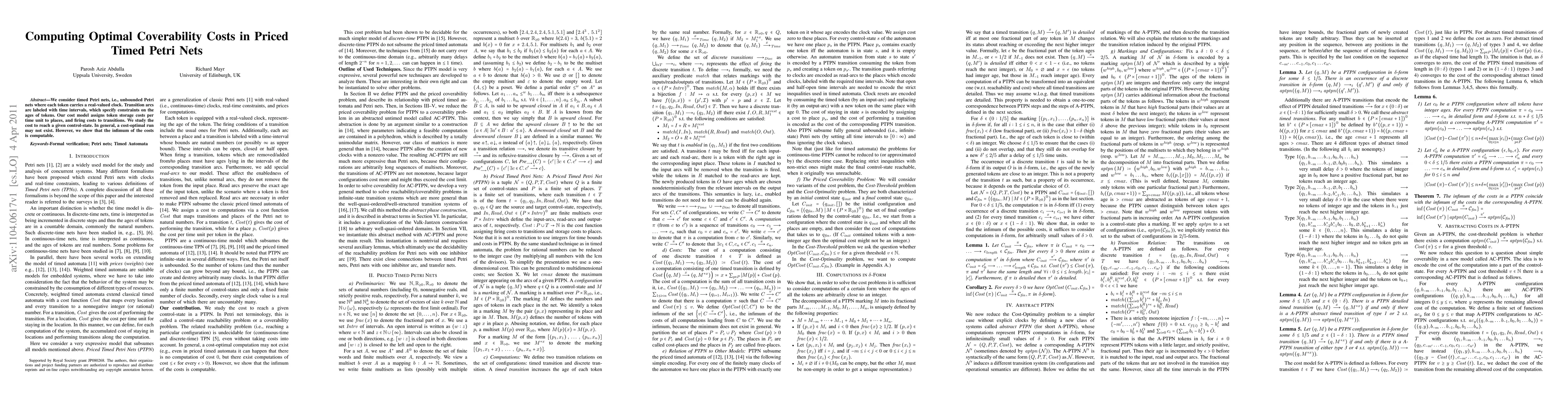 This paper explores optimal coverability costs in priced timed Petri nets, where tokens carry real-time clocks and transitions have time interval constraints. It demonstrates that while a cost-optimal run may not always exist, the infimum of possible costs is computable.