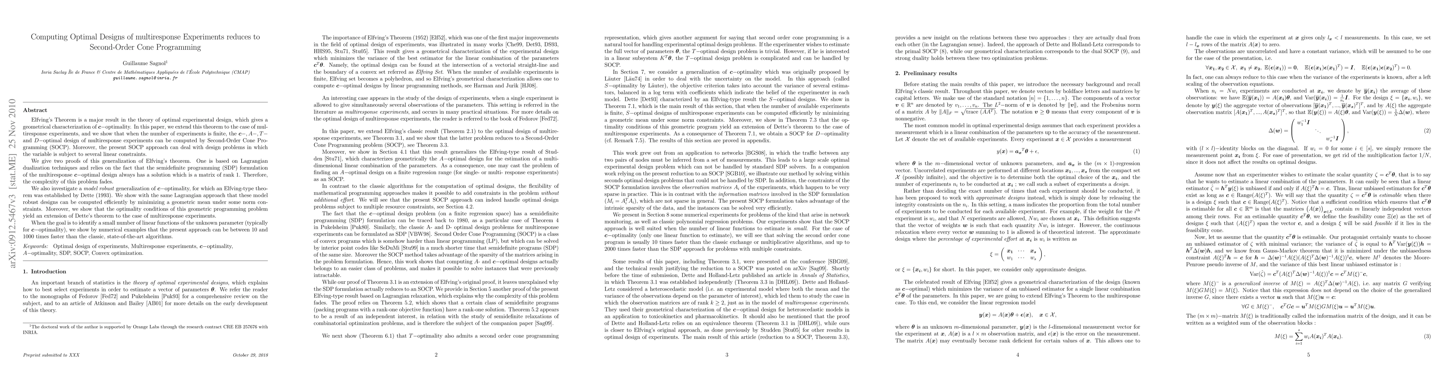 This paper extends Elfving's Theorem to multiresponse experiments, demonstrating that $c-,A-,T-$ and $D-$optimal designs can be computed via Second-Order Cone Programming (SOCP). The authors provide two proofs, showing that SOCP can efficiently handle design problems with linear constraints, and highlight its computational advantages over traditional methods.
