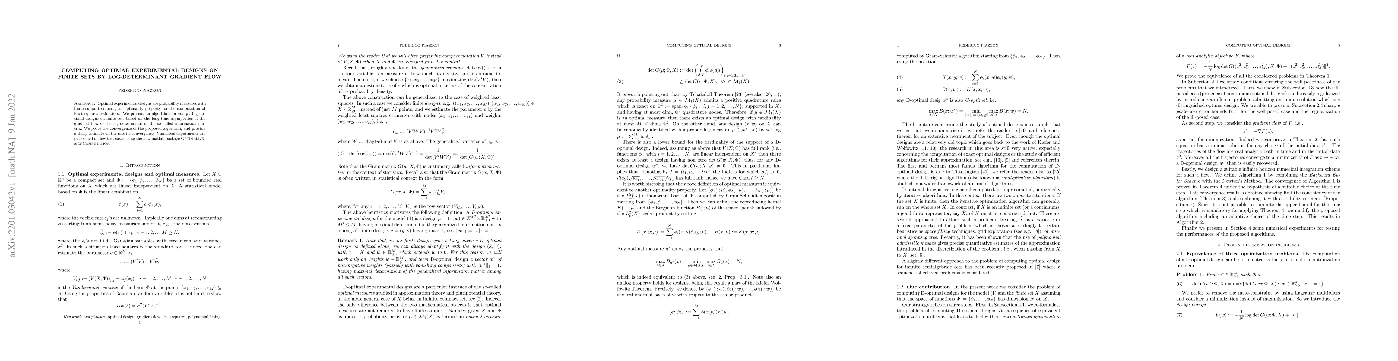 Researchers developed an algorithm to optimize experimental designs on finite sets using a gradient flow method based on log-determinant analysis, achieving convergence and rate estimates for optimal design computation.