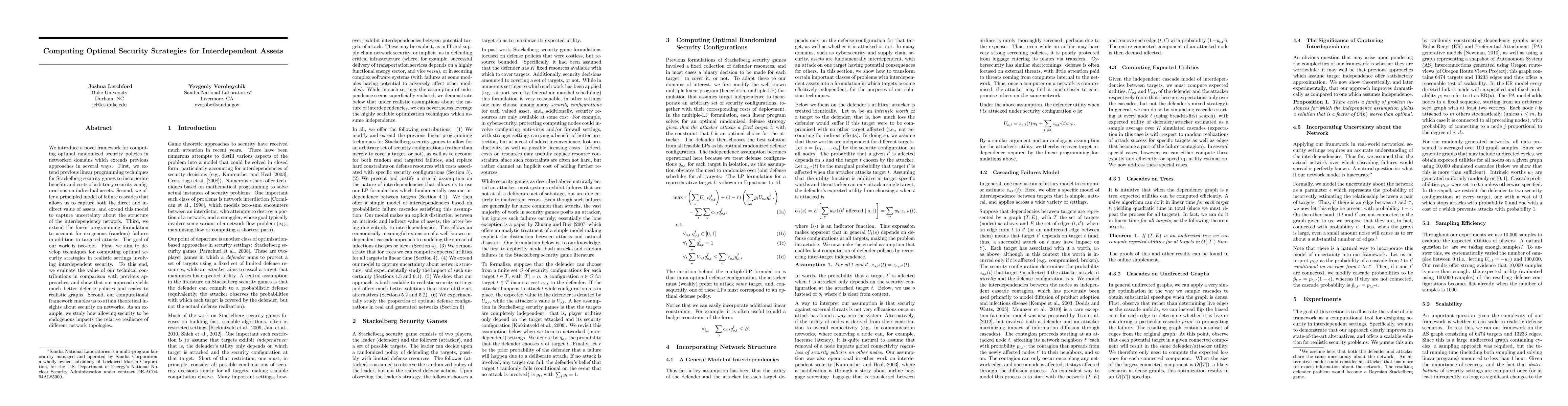 We introduce a novel framework for computing optimal randomized security policies in networked domains which extends previous approaches in several ways. First, we extend previous linear programming techniques for Stackelberg security games to incorporate benefits and costs of arbitrary security configurations on individual assets. Second, we offer a principled model of failure cascades that allows us to capture both the direct and indirect value of assets, and extend this model to capture uncertainty about the structure of the interdependency network. Third, we extend the linear programming formulation to account for exogenous (random) failures in addition to targeted attacks. The goal of our work is two-fold. First, we aim to develop techniques for computing optimal security strategies in realistic settings involving interdependent security. To this end, we evaluate the value of our technical contributions in comparison with previous approaches, and show that our approach yields much better defense policies and scales to realistic graphs. Second, our computational framework enables us to attain theoretical insights about security on networks. As an example, we study how allowing security to be endogenous impacts the relative resilience of different network topologies.