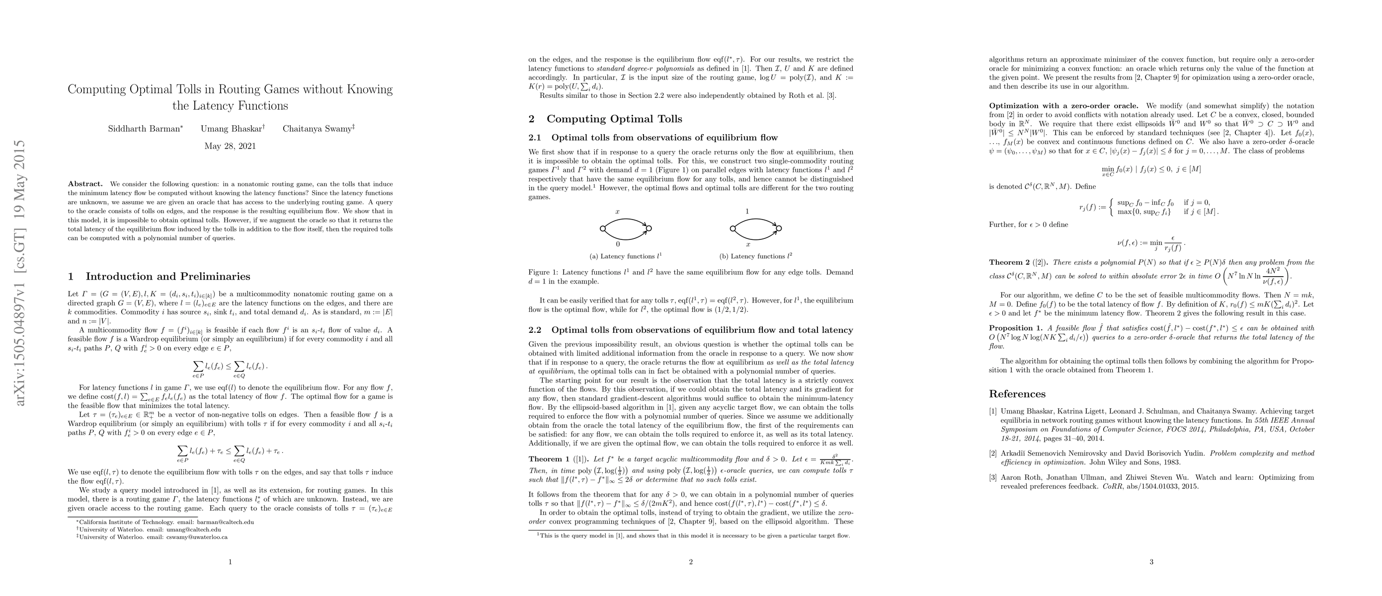 This paper explores the computation of optimal tolls in nonatomic routing games without prior knowledge of latency functions. It concludes that optimal tolls cannot be determined without an oracle, but if the oracle provides additional total latency data, optimal tolls can be computed with a polynomial number of queries.
