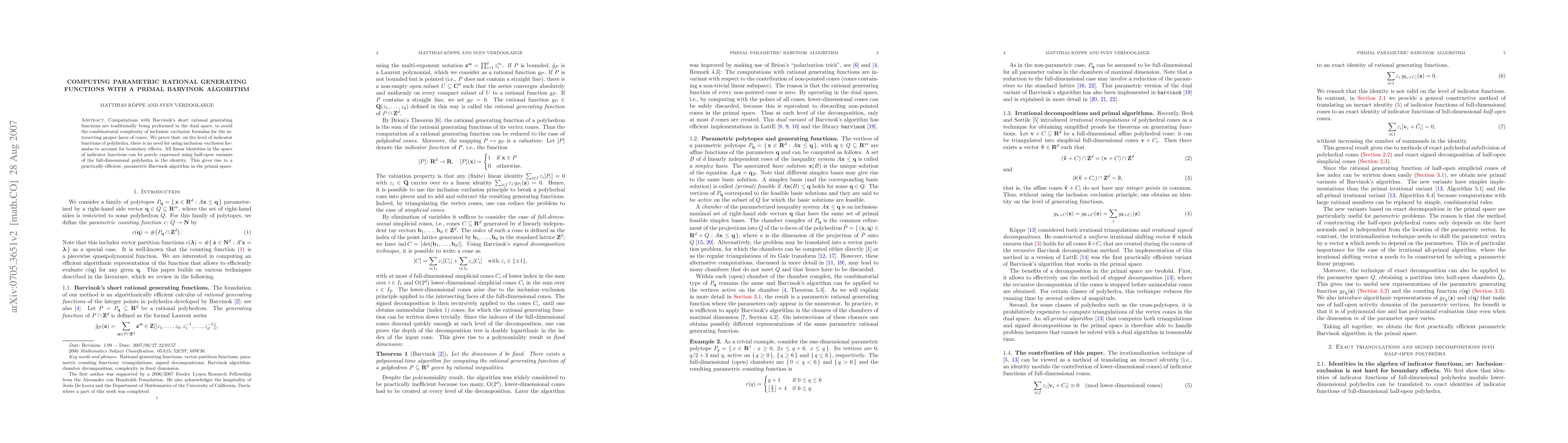 This paper proposes a primal space algorithm for computing parametric rational generating functions using Barvinok's method, eliminating the need for dual space computations and inclusion-exclusion formulas, thus simplifying boundary effect calculations. The new approach leverages half-open variants of polyhedra for linear identities, resulting in a more efficient algorithm.