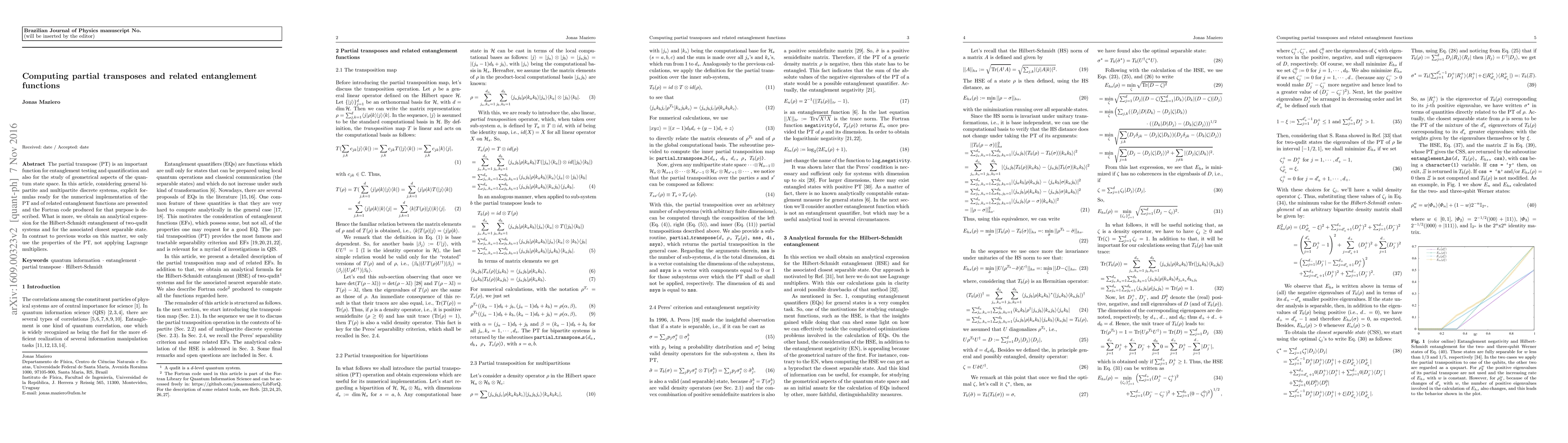 The partial transpose (PT) is an important function for entanglement testing and quantification and also for the study of geometrical aspects of the quantum state space. In this article, considering general bipartite and multipartite discrete systems, explicit formulas ready for the numerical implementation of the PT and of related entanglement functions are presented and the Fortran code produced for that purpose is described. What is more, we obtain an analytical expression for the Hilbert-Schmidt entanglement of two-qudit systems and for the associated closest separable state. In contrast to previous works on this matter, we only use the properties of the PT, not applying Lagrange multipliers.
