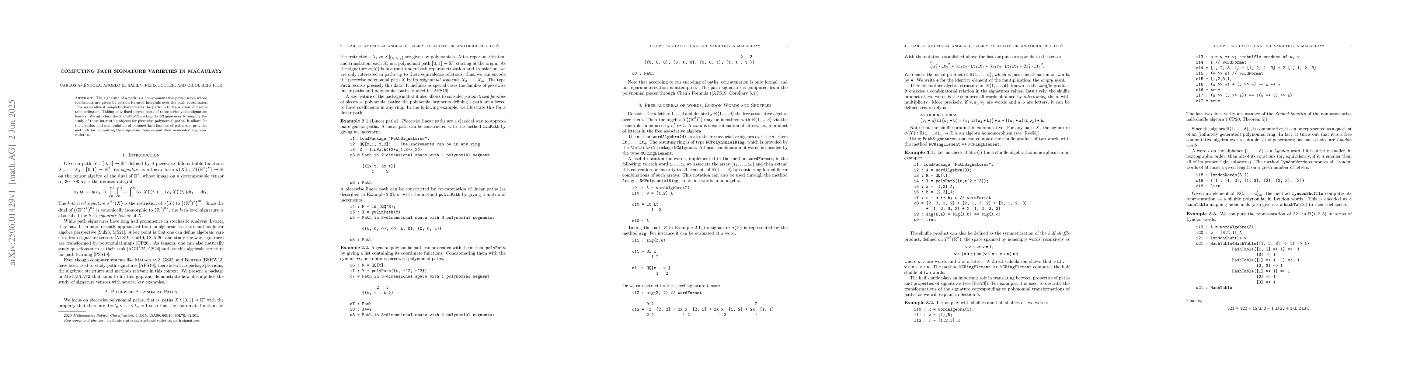 The paper introduces the Macaulay2 package \texttt{PathSignatures} for studying signature tensors of piecewise polynomial paths, enabling the creation and manipulation of parametrized families of paths and computation of their signature tensors and associated algebraic varieties.