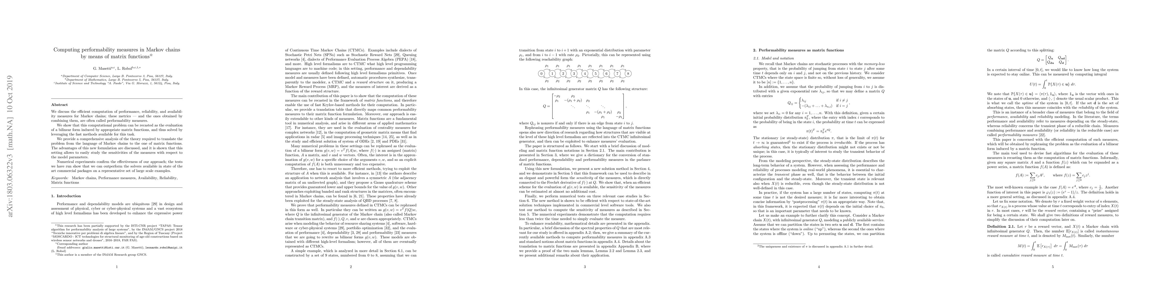 This paper presents an efficient method for computing performance, reliability, and availability measures in Markov chains by translating the problem into matrix function evaluations. The new formulation leverages fast matrix computation methods, offering advantages in sensitivity analysis and computational efficiency, as demonstrated by numerical experiments.