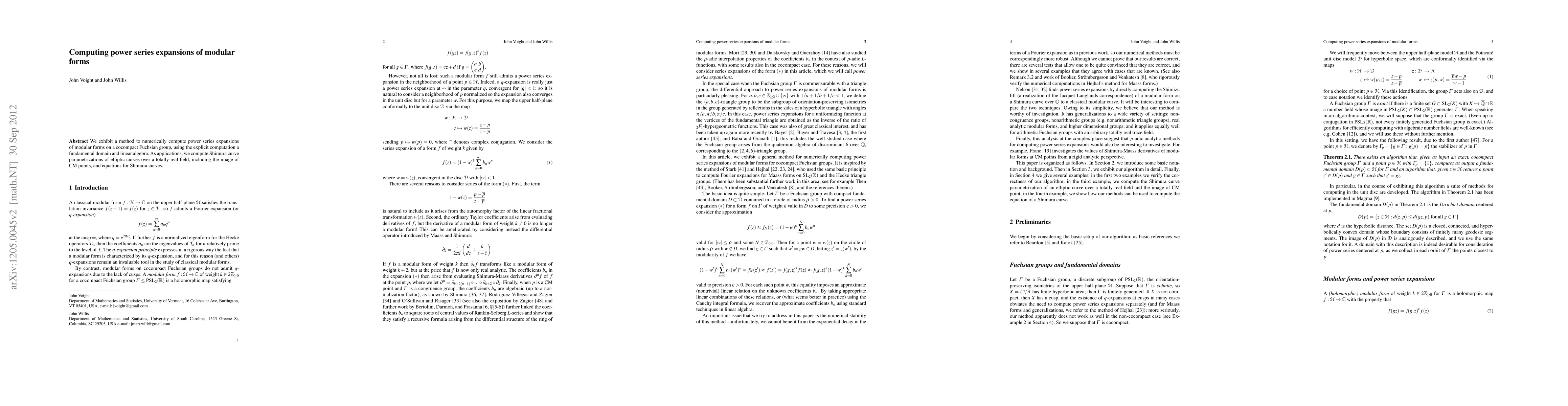 Summary: This paper presents a method for numerically computing power series expansions of modular forms via explicit fundamental domain computation and linear algebra techniques. The approach leverages cocompact Fuchsian groups to achieve the desired expansions.