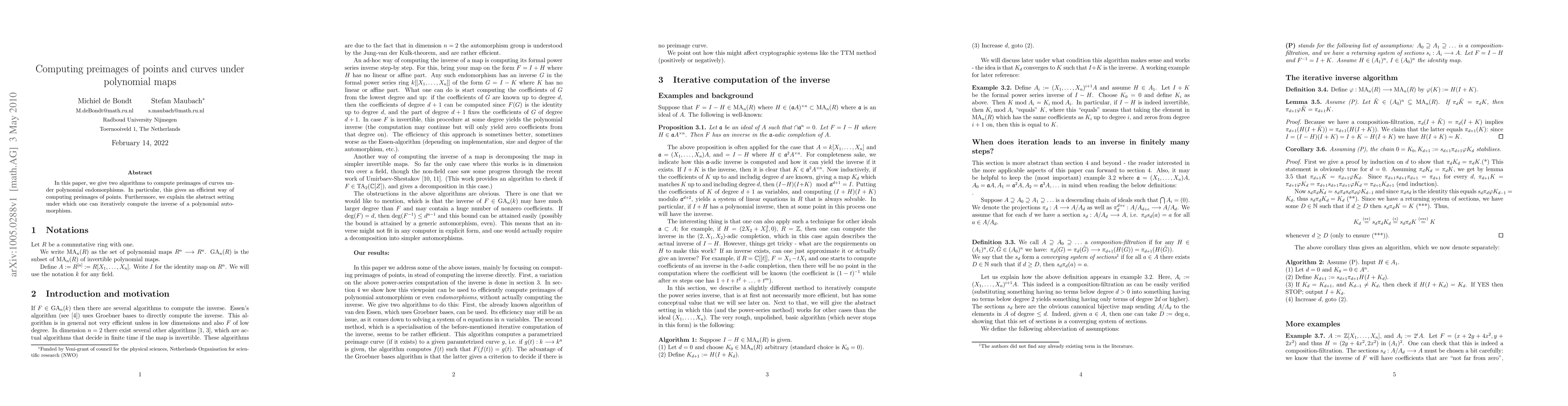 This paper presents two algorithms for computing preimages of curves under polynomial endomorphisms, providing an efficient method for finding preimages of points. It also discusses the abstract framework for iteratively computing the inverse of a polynomial automorphism.