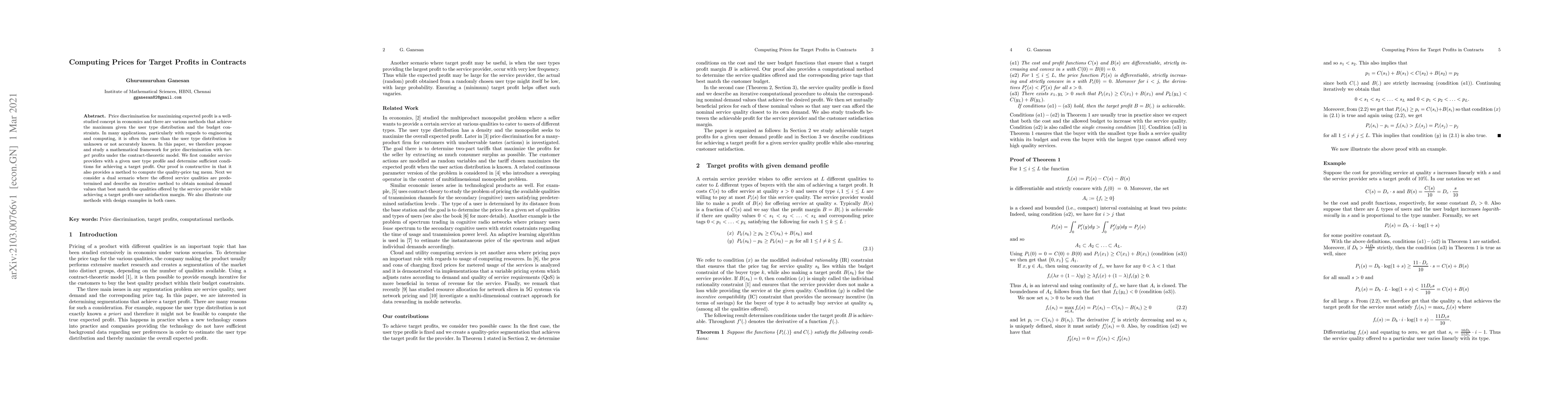 Price discrimination for maximizing expected profit is a well-studied concept in economics and there are various methods that achieve the maximum given the user type distribution and the budget constraints. In many applications, particularly with regards to engineering and computing, it is often the case than the user type distribution is unknown or not accurately known. In this paper, we therefore propose and study a mathematical framework for price discrimination with \emph{target} profits under the contract-theoretic model. We first consider service providers with a given user type profile and determine sufficient conditions for achieving a target profit. Our proof is constructive in that it also provides a method to compute the quality-price tag menu. Next we consider a dual scenario where the offered service qualities are predetermined and describe an iterative method to obtain nominal demand values that best match the qualities offered by the service provider while achieving a target profit-user satisfaction margin. We also illustrate our methods with design examples in both cases.