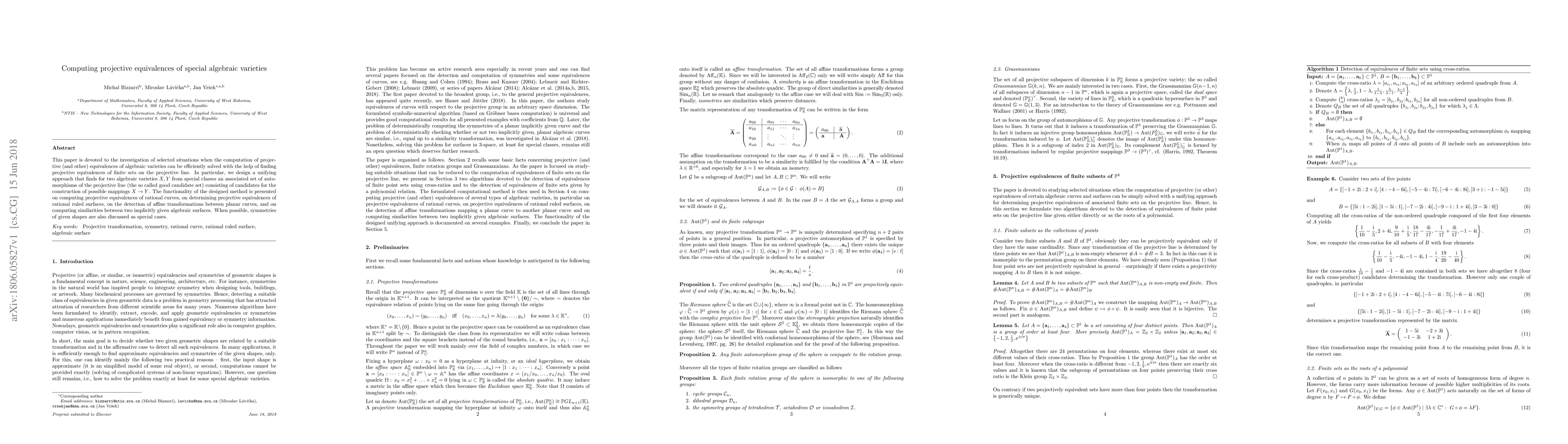This paper develops a method for efficiently computing projective equivalences of special algebraic varieties by leveraging projective equivalences of finite sets on the projective line, demonstrating its utility in various contexts including rational curves, rational ruled surfaces, planar curves, and implicitly defined algebraic surfaces. Symmetries of given shapes are also considered where applicable.