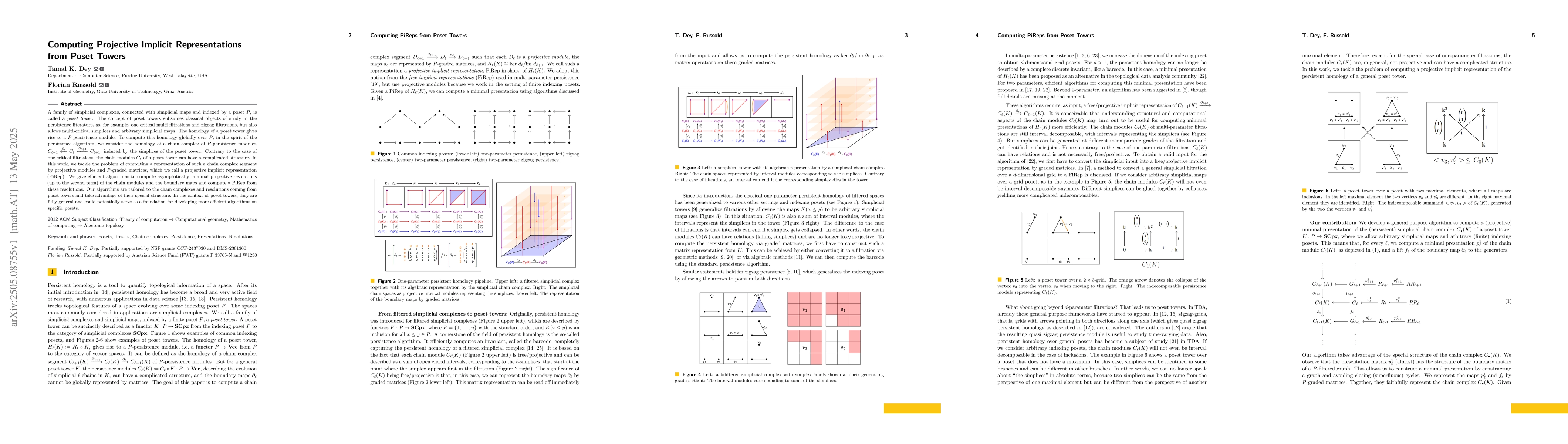 The paper introduces poset towers, a family of simplicial complexes with simplicial maps indexed by a poset P, and explores their homology leading to a P-persistence module. It aims to compute a projective implicit representation (PiRep) of chain complex segments from these poset towers, utilizing efficient algorithms for minimal projective resolutions.