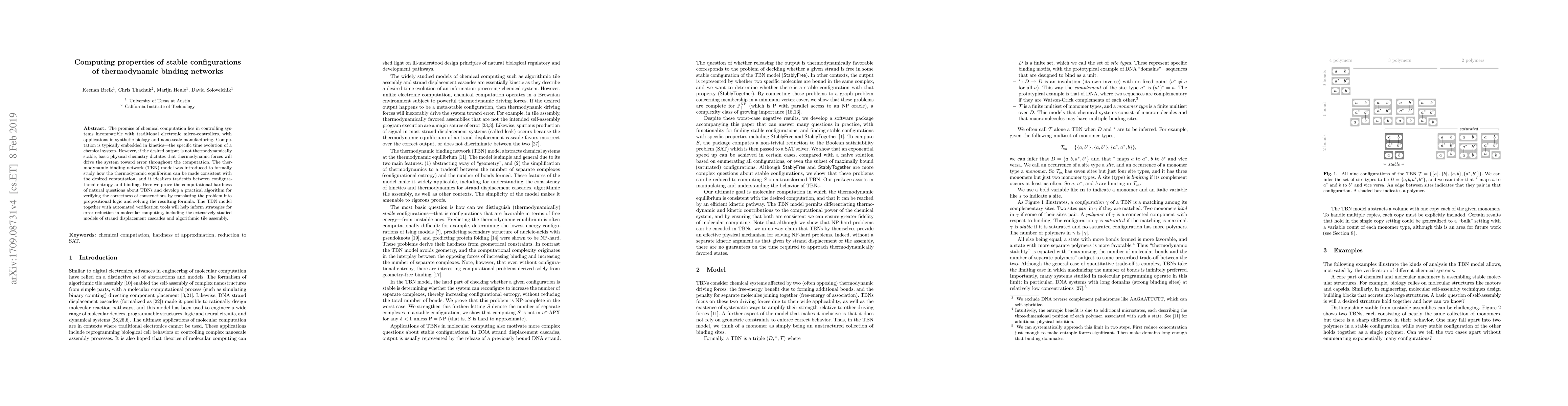 The promise of chemical computation lies in controlling systems incompatible with traditional electronic micro-controllers, with applications in synthetic biology and nano-scale manufacturing. Computation is typically embedded in kinetics---the specific time evolution of a chemical system. However, if the desired output is not thermodynamically stable, basic physical chemistry dictates that thermodynamic forces will drive the system toward error throughout the computation. The thermodynamic binding network (TBN) model was introduced to formally study how the thermodynamic equilibrium can be made consistent with the desired computation, and it idealizes tradeoffs between configurational entropy and binding. Here we prove the computational hardness of natural questions about TBNs and develop a practical algorithm for verifying the correctness of constructions by translating the problem into propositional logic and solving the resulting formula. The TBN model together with automated verification tools will help inform strategies for error reduction in molecular computing, including the extensively studied models of strand displacement cascades and algorithmic tile assembly.