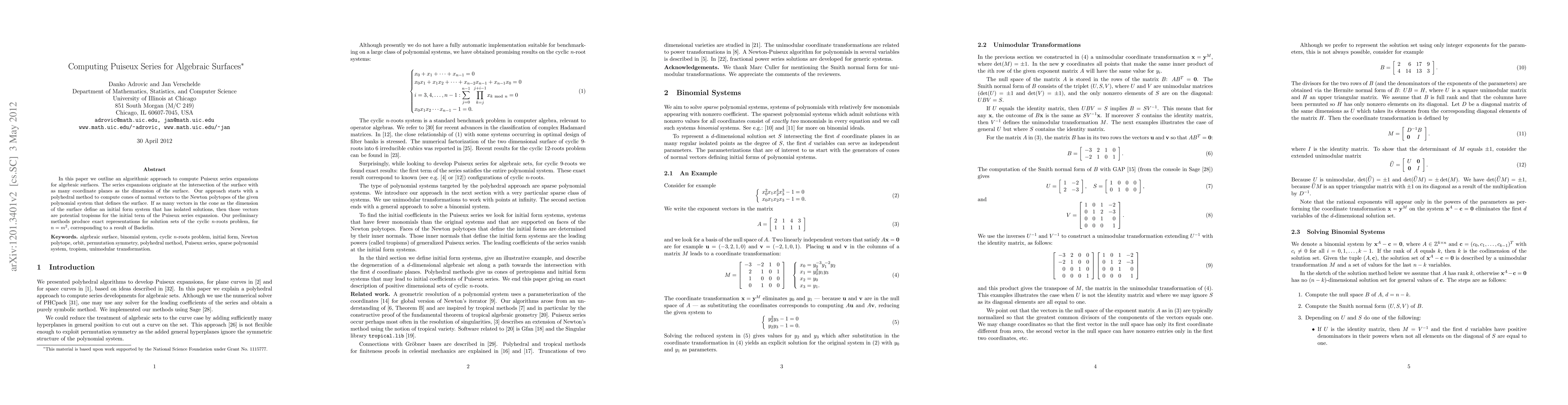 In this paper we outline an algorithmic approach to compute Puiseux series expansions for algebraic surfaces. The series expansions originate at the intersection of the surface with as many coordinate planes as the dimension of the surface. Our approach starts with a polyhedral method to compute cones of normal vectors to the Newton polytopes of the given polynomial system that defines the surface. If as many vectors in the cone as the dimension of the surface define an initial form system that has isolated solutions, then those vectors are potential tropisms for the initial term of the Puiseux series expansion. Our preliminary methods produce exact representations for solution sets of the cyclic $n$-roots problem, for $n = m^2$, corresponding to a result of Backelin.