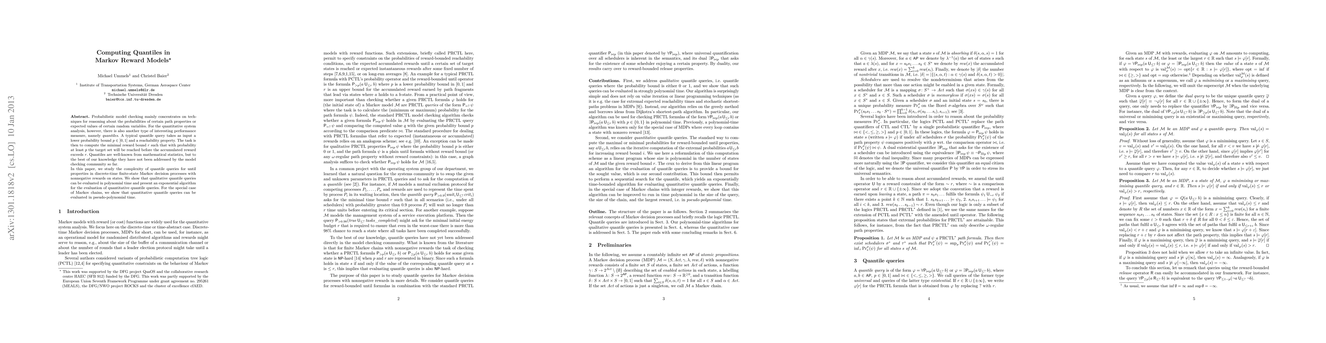 Probabilistic model checking mainly concentrates on techniques for reasoning about the probabilities of certain path properties or expected values of certain random variables. For the quantitative system analysis, however, there is also another type of interesting performance measure, namely quantiles. A typical quantile query takes as input a lower probability bound p and a reachability property. The task is then to compute the minimal reward bound r such that with probability at least p the target set will be reached before the accumulated reward exceeds r. Quantiles are well-known from mathematical statistics, but to the best of our knowledge they have not been addressed by the model checking community so far. In this paper, we study the complexity of quantile queries for until properties in discrete-time finite-state Markov decision processes with non-negative rewards on states. We show that qualitative quantile queries can be evaluated in polynomial time and present an exponential algorithm for the evaluation of quantitative quantile queries. For the special case of Markov chains, we show that quantitative quantile queries can be evaluated in time polynomial in the size of the chain and the maximum reward.