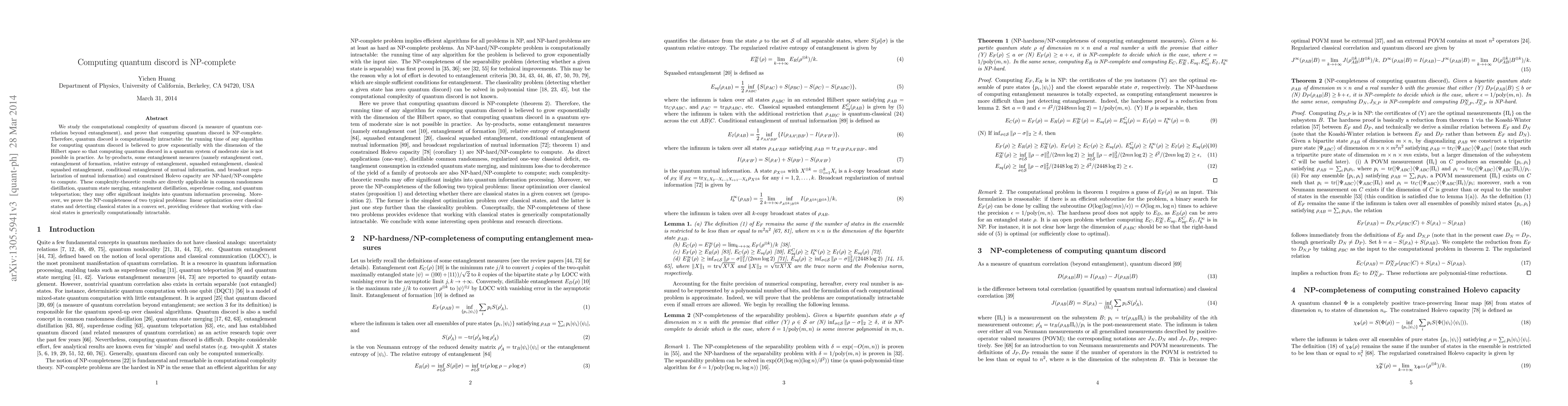 This paper demonstrates that computing quantum discord is NP-complete, indicating its computational intractability. Additionally, it shows that several entanglement measures and constrained Holevo capacity are also NP-hard/NP-complete, impacting practical quantum information processing tasks.