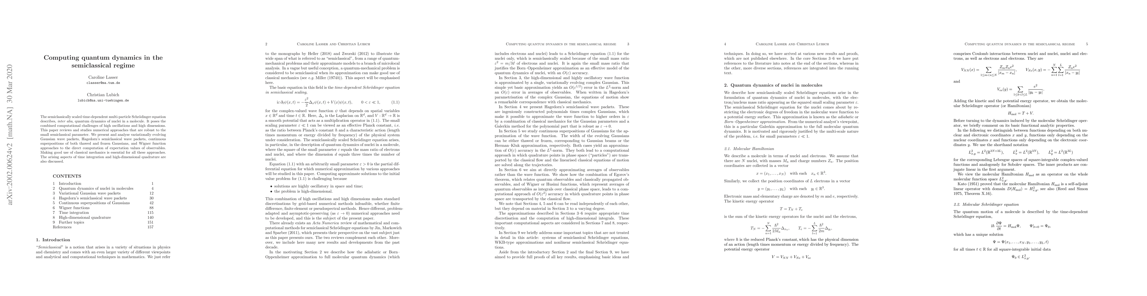 The semiclassically scaled time-dependent multi-particle Schr\"odinger equation describes, inter alia, quantum dynamics of nuclei in a molecule. It poses the combined computational challenges of high oscillations and high dimensions. This paper reviews and studies numerical approaches that are robust to the small semiclassical parameter. We present and analyse variationally evolving Gaussian wave packets, Hagedorn's semiclassical wave packets, continuous superpositions of both thawed and frozen Gaussians, and Wigner function approaches to the direct computation of expectation values of observables. Making good use of classical mechanics is essential for all these approaches. The arising aspects of time integration and high-dimensional quadrature are also discussed.
