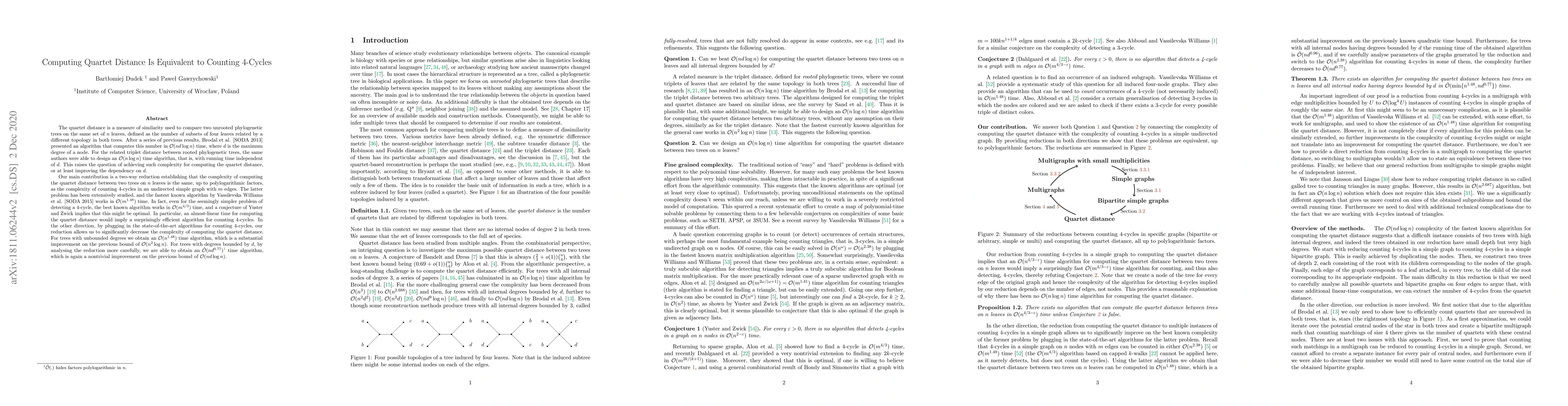 This paper demonstrates a two-way reduction showing that computing quartet distance between phylogenetic trees is equivalent to counting 4-cycles in graphs, leading to improved algorithms for both tasks. It establishes a connection between the complexity of quartet distance computation and the fastest known algorithms for counting 4-cycles, yielding improved time complexities for quartet distance calculation.