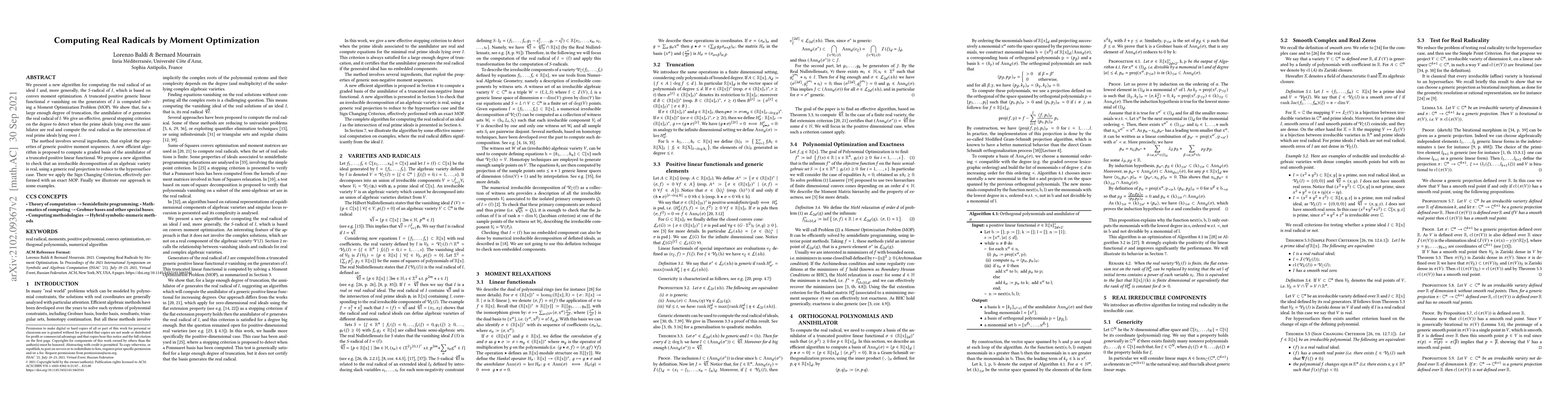 We present a new algorithm for computing the real radical of an ideal and, more generally, the-radical of, which is based on convex moment optimization. A truncated positive generic linear functional vanishing on the generators of is computed solving a Moment Optimization Problem (MOP). We show that, for a large enough degree of truncation, the annihilator of generates the real radical of. We give an effective, general stopping criterion on the degree to detect when the prime ideals lying over the annihilator are real and compute the real radical as the intersection of real prime ideals lying over. The method involves several ingredients, that exploit the properties of generic positive moment sequences. A new efficient algorithm is proposed to compute a graded basis of the annihilator of a truncated positive linear functional. We propose a new algorithm to check that an irreducible decomposition of an algebraic variety is real, using a generic real projection to reduce to the hypersurface case. There we apply the Sign Changing Criterion, effectively performed with an exact MOP. Finally we illustrate our approach in some examples.