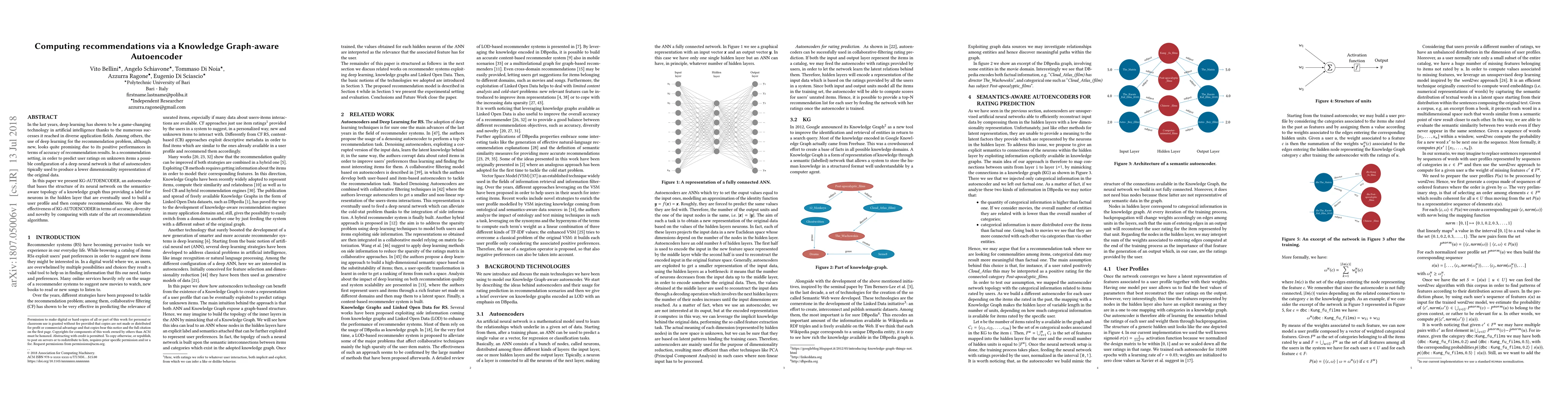 This paper introduces KG-AUTOENCODER, an autoencoder that uses a knowledge graph to generate user profiles and improve recommendation accuracy. It compares favorably to state-of-the-art algorithms in terms of accuracy, diversity, and novelty.