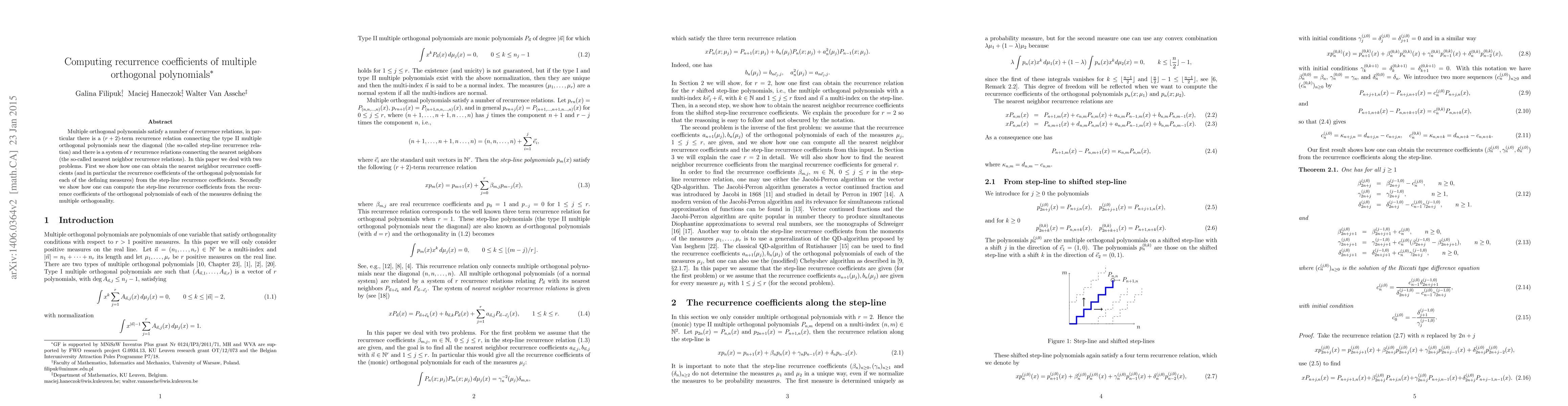 Multiple orthogonal polynomials satisfy a number of recurrence relations, in particular there is a $(r+2)$-term recurrence relation connecting the type II multiple orthogonal polynomials near the diagonal (the so-called step-line recurrence relation) and there is a system of $r$ recurrence relations connecting the nearest neighbors (the so-called nearest neighbor recurrence relations). In this paper we deal with two problems. First we show how one can obtain the nearest neighbor recurrence coefficients (and in particular the recurrence coefficients of the orthogonal polynomials for each of the defining measures) from the step-line recurrence coefficients. Secondly we show how one can compute the step-line recurrence coefficients from the recurrence coefficients of the orthogonal polynomials of each of the measures defining the multiple orthogonality.