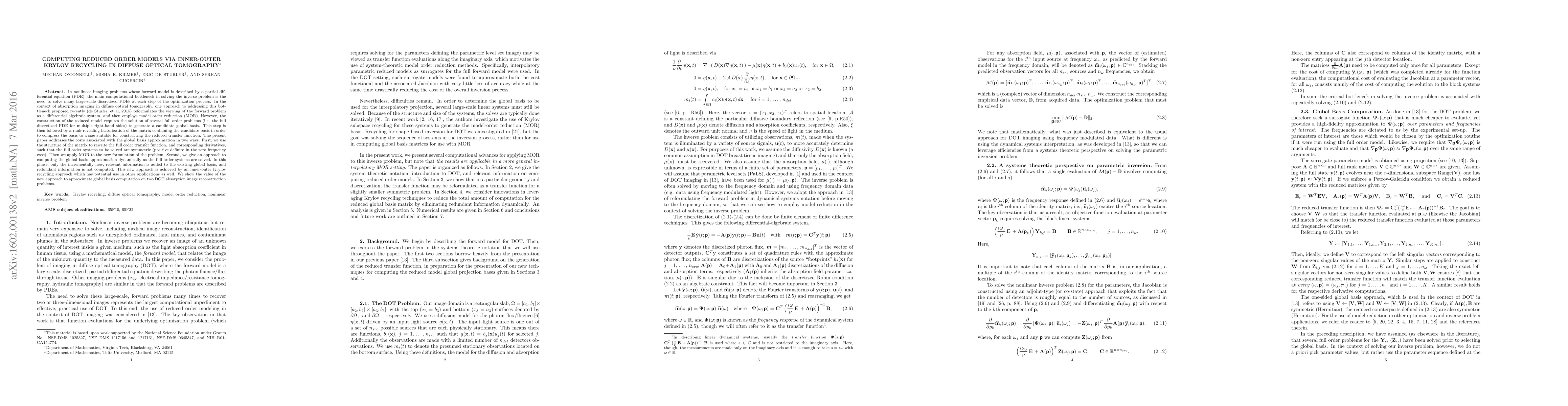 This paper proposes a method to reduce computational costs in solving the inverse problem in diffuse optical tomography by employing inner-outer Krylov recycling for model order reduction. It reformulates the forward problem to make full order systems symmetric and applies dynamic global basis approximation to avoid redundant computations.